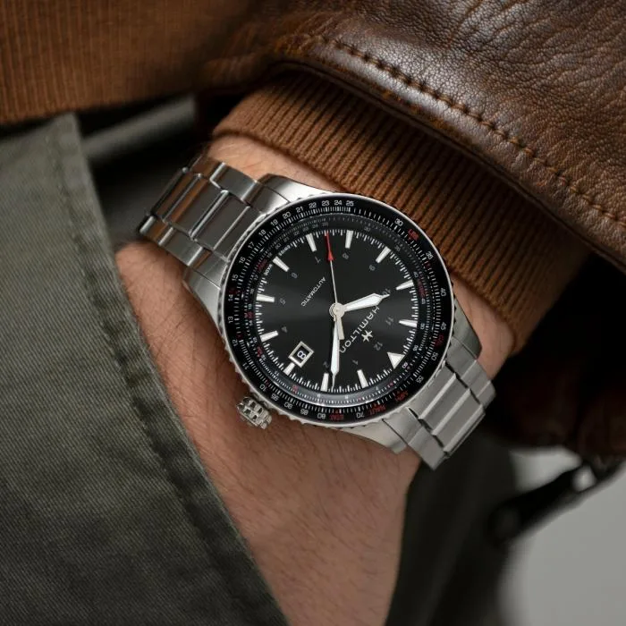 Being a part of the same family, the new Hamilton Khaki Converter watches have a lot in common. First and foremost is the rotating slide rule bezel. In times when a flight runs in autopilot mode for the most time, a slide rule bezel does sound a little impractical, however, it is a nifty feature that can help the wearer make all sorts of unit and currency conversions. Moving on, all watches come with stainless steel cases (PVD treated on some variations) that are water-resistant to 100 meters, are equipped with a nice grippy oversized crown, and feature sapphire crystals on both front as well as the back. The dials like the cases share the same basic layout. So, you get applied lume filled batons and a triangle at 12 for hours, a printed minute track, nicely proportioned lume filled sword-shaped hour and minute hands and a red arrow tipped second’s hand. Now let’s have a quick look at the individual references