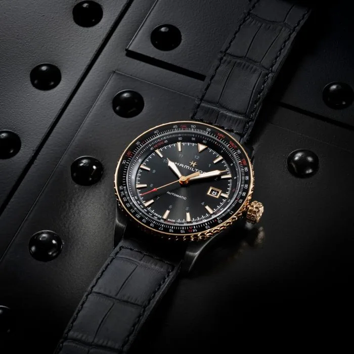 As the name suggests this watch enables the wearer to track an additional time zone. To do so the watch has been equipped with a fourth hand and a 24-hour chapter ring. Packed inside a 44mm case, the blue sunburst dial has looks vibrant and offers a nice contrast to the applied markers. A nice thoughtful touch is that the date window has been placed at 6 instead of 3 making the dial look more symmetrical. Powering this watch is the Hamilton H-14 caliber that like it’s three-hand cousin offers a power reserve of around 80 hours. The watch would cost CHF 1,395 on the brown leather strap and CHF 1,495 on the stainless-steel bracelet.