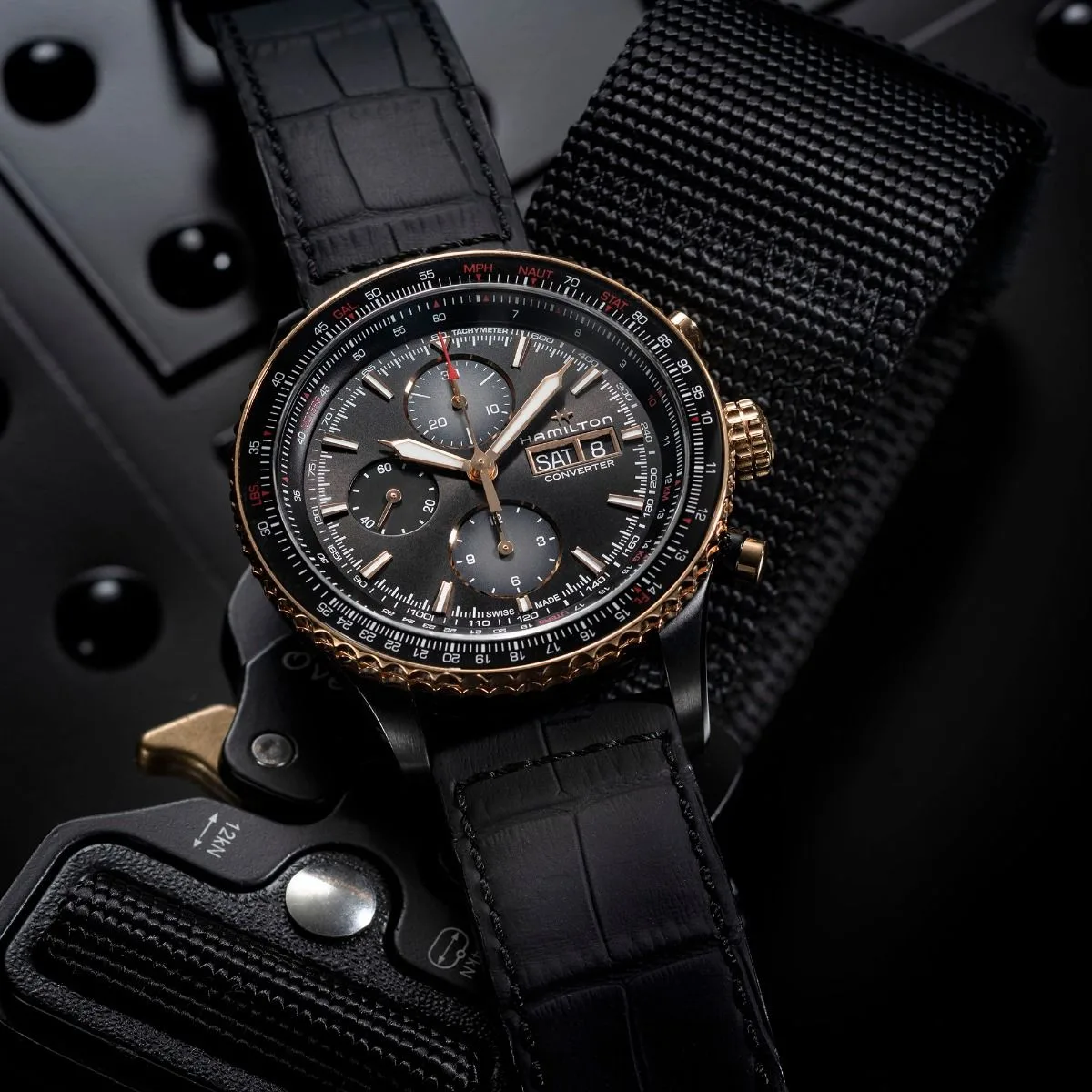 The most complicated amongst the new Aviation converter watches is the Converter chronograph. Presented in black, the dial on this watch features a tri-compax layout with three sub-registers at 6,9 and 12 along with a day/date display at 3. Interestingly the chronograph registers have been given a gradient effect that not only adds a ton of visual character but also helps in segregating the chronograph functions from normal timekeeping. The case once again measures 44mm in diameter and powering this watch the Hamilton H-21-Si caliber. This movement features a silicon hairspring and offers an autonomy of around 60 hours. The retail price starts at CHF 1,950 and goes up to CHF 2,095 for the PVD variant.