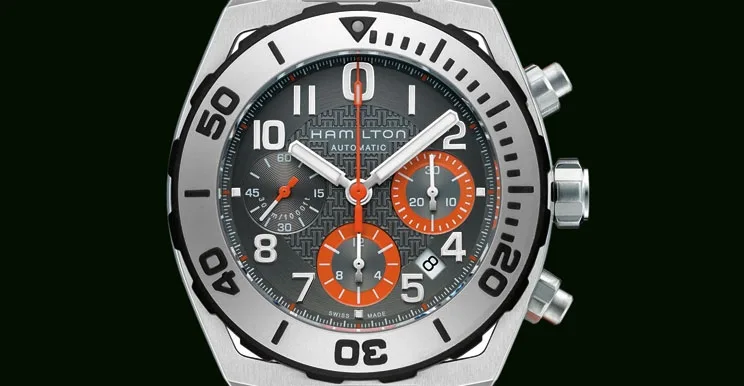 Hamilton has a proven affinity to water, perfectly reflected by its long list of appearances in movies with aquatic themes. The Hamilton Khaki Sub Auto Chrono is a true celebration of this proven capacity for products that make waves, which has ranged from acting as vital equipment for heroic military divers in The Frogmen (1951), to a lesson in shark-avoidance in the underwater action film, Into the Blue (2005). The spirit of the sea penetrates all aspects of the watch’s design. Complementing water resistance to 30 bar (300m) are features ranging from the embossed illustration of a manta ray on the case back, to a super-sporty bezel. The latter offers excellent grip and presents rubber emerging from the stainless steel to create an intriguing 3D effect. The dynamic chronograph’s easy-to-grip, screw-down crown and pushers are reminiscent of diving bottle valves, reinforcing the statement of reliability and robustness. A combination of polished and sandblasted surfaces introduces currents of sophistication, confirming the timepiece’s uniquely amphibious appeal, taking on board upstream and downtown styling preferences.