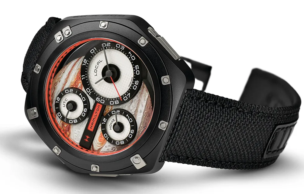 The black case and bezel of the watch encase a beautiful face featuring one main dial on the right side of the face and two other sub-dials on the left side. The main dial prominently displays the local time with the left dials functioning as a second a minutes timer respectively. A black rectangle with a red stripe proudly displays the word ‘Hamilton’ and the Hamilton logo in red as well. The placement of the logo in between the two left dials and on the side of the right dial gives the overall appearance of a satellite or a spaceship. The most important feature of the face is its background display of Jupiter floating in space. The very bright white, orange, and brown colors swirling across the planet’s surface along with the black background of space give the planet a 3-D appearance. The satellite or spaceship created from the dials and the Hamilton logo gives an appearance that the background planet is being orbited.