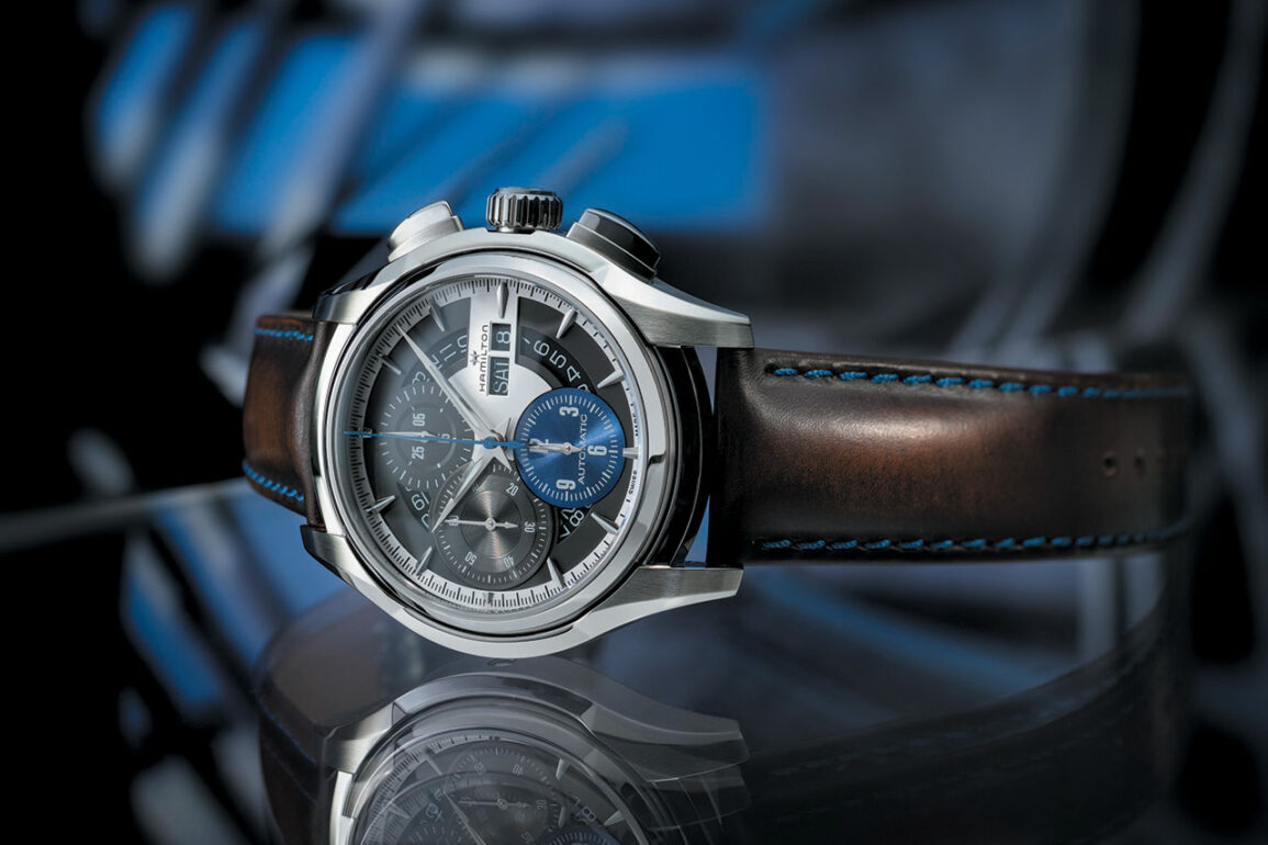The primary dial has a dark grey base and a saturated blue on the seconds hand and chronograph’s hours subdial. The three subdials are completely different from one another in size and style, accompanied by pointed hands. The dial is enveloped by a date wheel, a strip with day-date is found beneath the Hamilton logo. The secondary dial has a single blue hand, responsible for the readings of the tachymeter, pulsometer and heart rates.