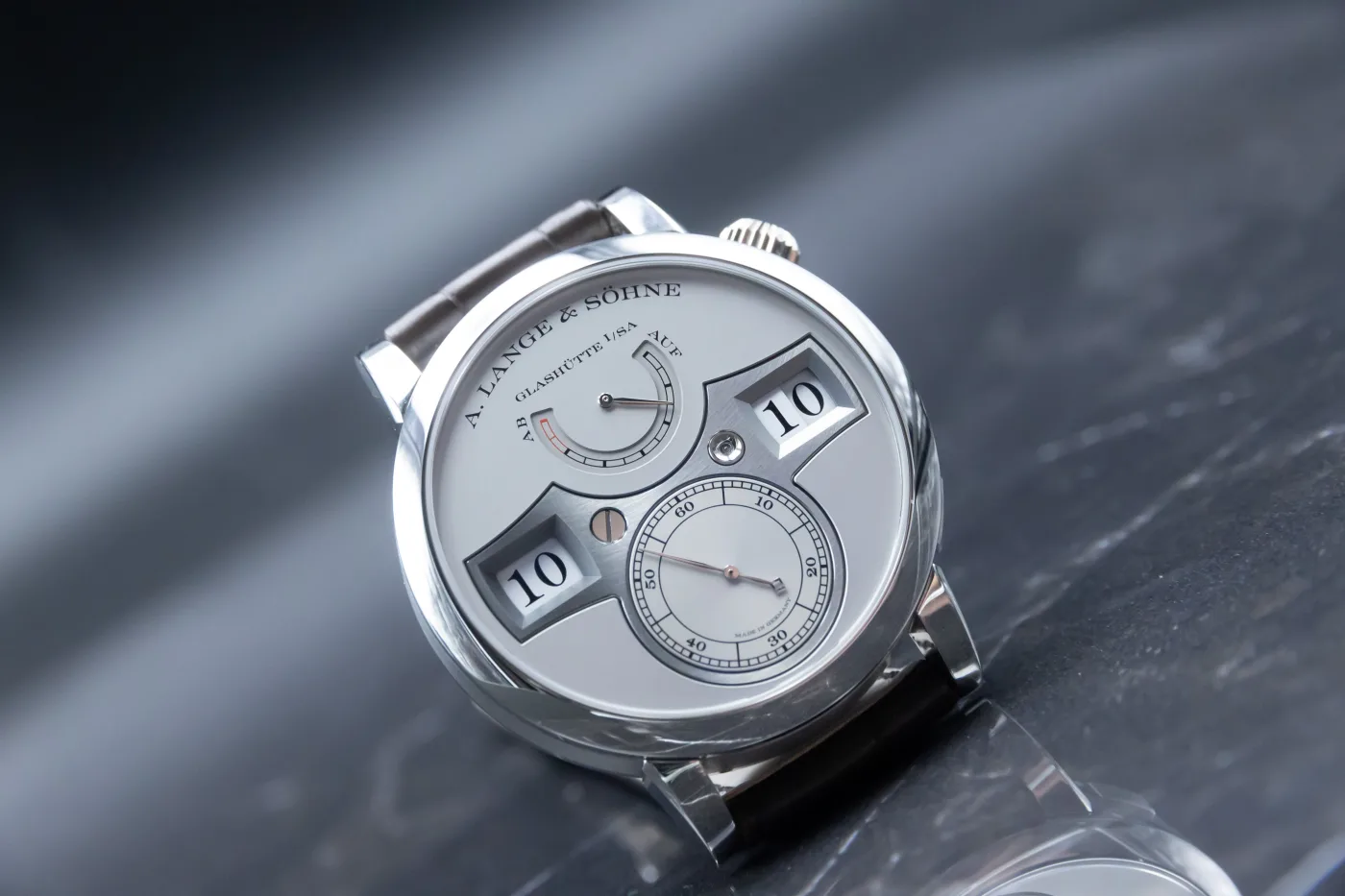 The gorgeously finished movement is sat within a 950 platinum case measuring precisely 41.9mm x 12.2mm. It’s presented on an alligator leather strap with a 950 platinum pin buckle to match the case. Despite platinum being heavy the watch is effortlessly wearable. It’s got that distinctive heft that I appreciate from A. Lange & Söhne’s watches, it gives you confidence that you’re strapping on a piece of precision German engineering. At 152 grams on our VSS (Very Scientific (Kitchen) Scales) it’s slightly lighter than A. Lange & Söhne’s Odysseus in stainless steel and slightly heavier than Zenith’s divisive stainless steel Chronomaster Sport EP watch.