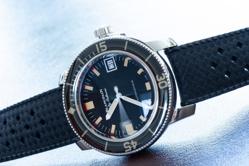 The steel case is 40.3mm in diameter, quite small compared to the standard 45mm seen in this range. At the boutique, Blancpain had out a titanium model in 45mm as well for size comparison, but I neglected to take photos of that one. Let me just say, though, that the smaller size is noticeable and welcome in some cases. This is a much friendlier watch to wear and could even be worn well as a daily, perhaps with a button shirt in some cases.