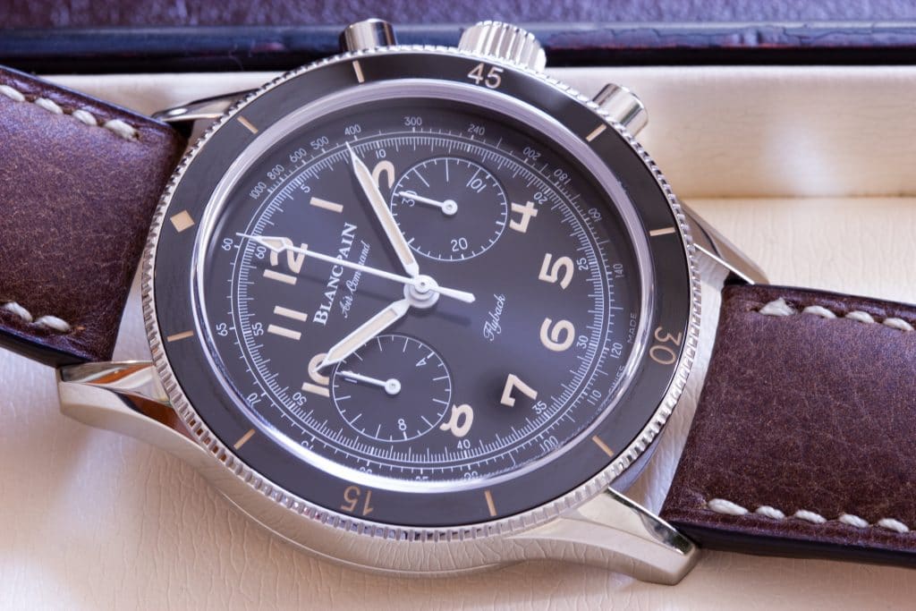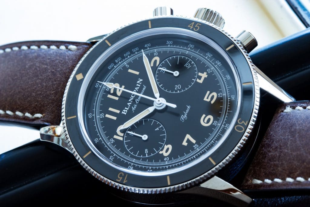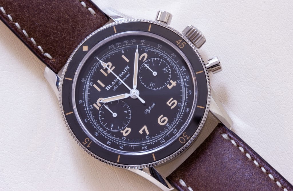 When I say correctly I mean they’ve taken the design, and they haven’t played around with the layout or changed that much. Sometimes we see watches that are supposed re-issues but have changed to incorporate a new movement or some such, and it’s not quite the same. While the Air-Command’s lineage is obvious, it hasn’t shied away from the face of modernity. The bezel is made of ceramic to resist scratches, the running seconds have been removed, and Blancpain has even refrained from including a date window to keep the design as original as possible.Â