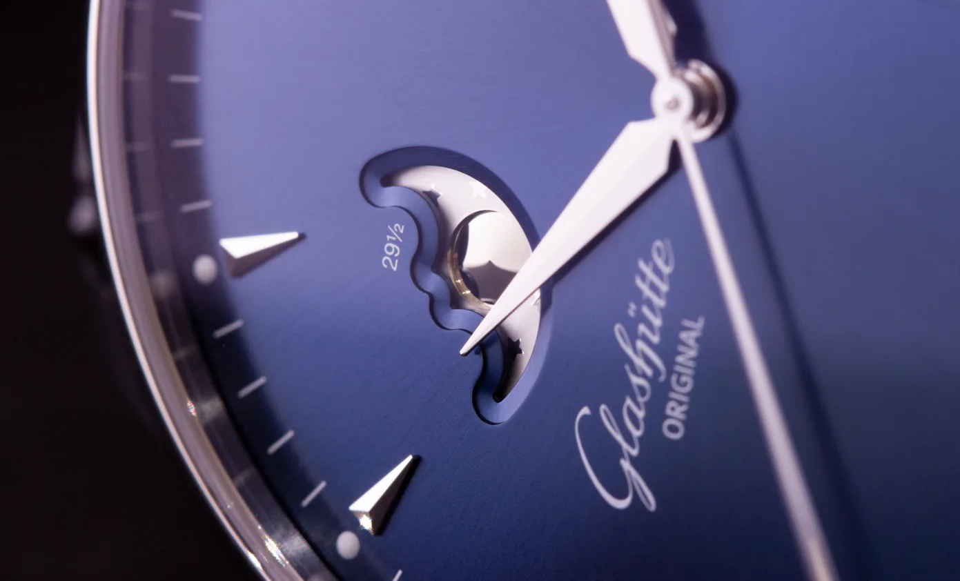 The dial is very clean, legible and oh-so German in design. Only the bare essentials here, there’s not much writing, and the Glashütte Original logo is quite small. Above that logo is the moon phase display. The moon phase itself is very accurate, requiring a reset only once every 122 years. It contrasts with the blue of the dial quite well, as the disk is silver, but this does make the tiny stars quite hard to make out, I know they are microscopic, but collectors of such fine timepieces enjoy examining them with a loupe. The moon itself is brilliantly polished and inverse domed in shape, this isn’t visible to the naked eye, but it does show up with a macro lens.