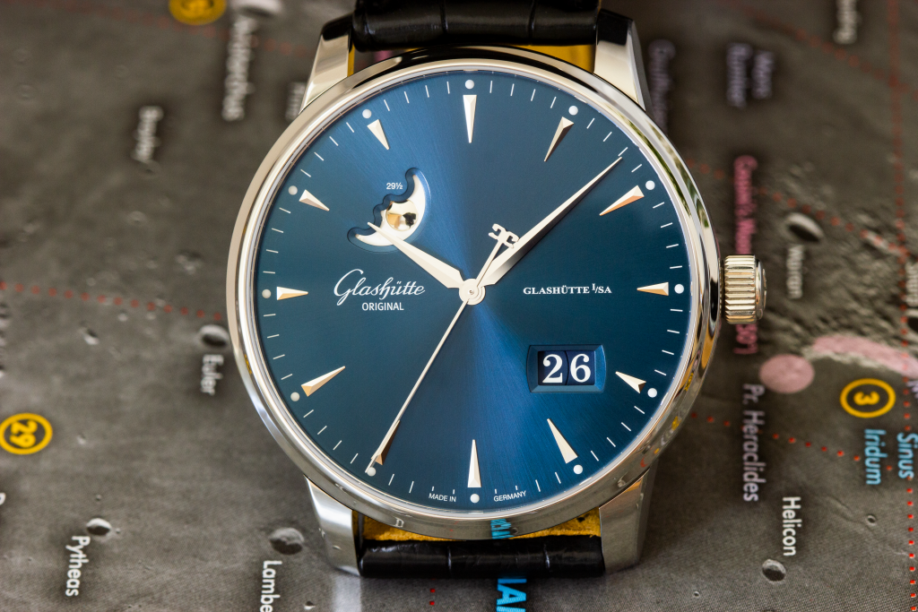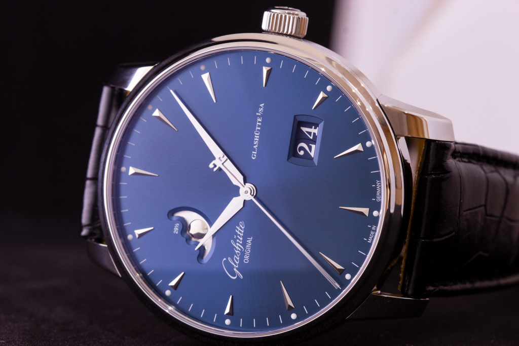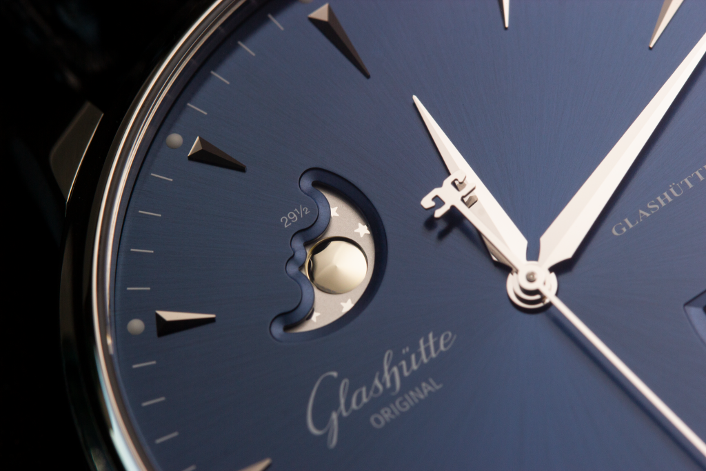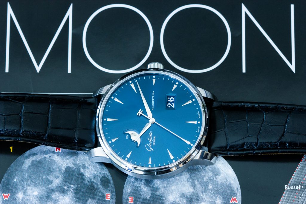 The dial is very clean, legible and oh-so German in design. Only the bare essentials here, there’s not much writing, and the Glashütte Original logo is quite small. Above that logo is the moon phase display. The moon phase itself is very accurate, requiring a reset only once every 122 years. It contrasts with the blue of the dial quite well, as the disk is silver, but this does make the tiny stars quite hard to make out, I know they are microscopic, but collectors of such fine timepieces enjoy examining them with a loupe. The moon itself is brilliantly polished and inverse domed in shape, this isn’t visible to the naked eye, but it does show up with a macro lens.