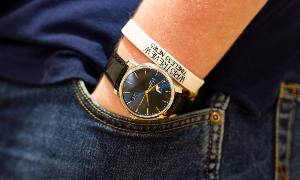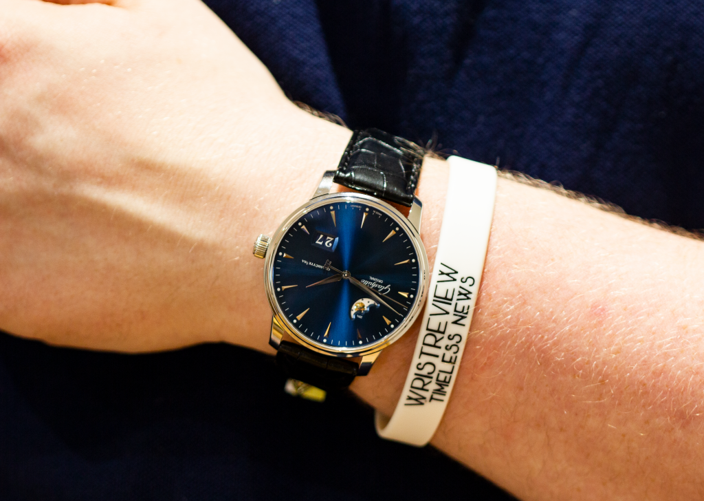 For example, the moon phase indicator is controlled and adjusted through the crown, making audible and satisfying clicks as it changes. Instead of a ridiculous pusher that requires a cocktail stick in the side of the case, pulling the crown out (the crown is not a screw down type) to its first position allows you to change the moon phase. If you turn it in the opposite direction to the moon phase, then you can quickly flick through the Panorama date. This is quite a traditional design element for this watchmaking region, but it adds a twist. Instead of layering the number disks one on top of the other, they are laid one inside the other, so there is no height difference, this is the correct way of doing it. I’m a little intrigued by the colour choice. I think if the numerals were blue on silver similar to the moon phase it could have produced more balance on the dial, or at least given a reason for the moon phase disk to be silver. I love the sunray effect, coupled with the blue dial, it pops when worn on the wrist and dressed with the appropriate attire.