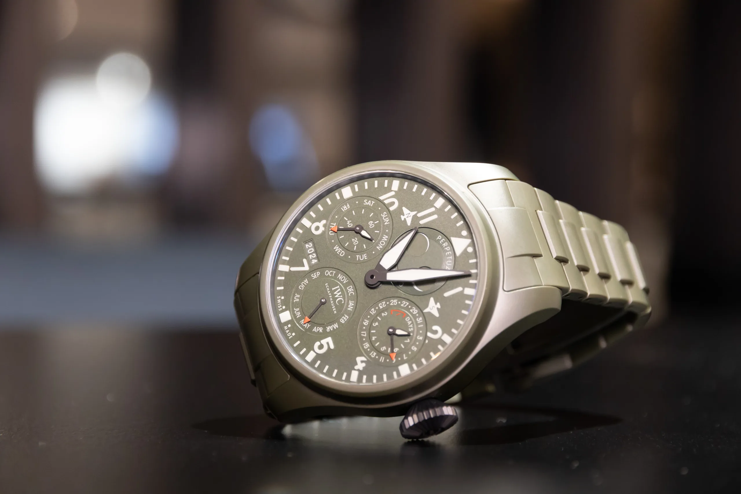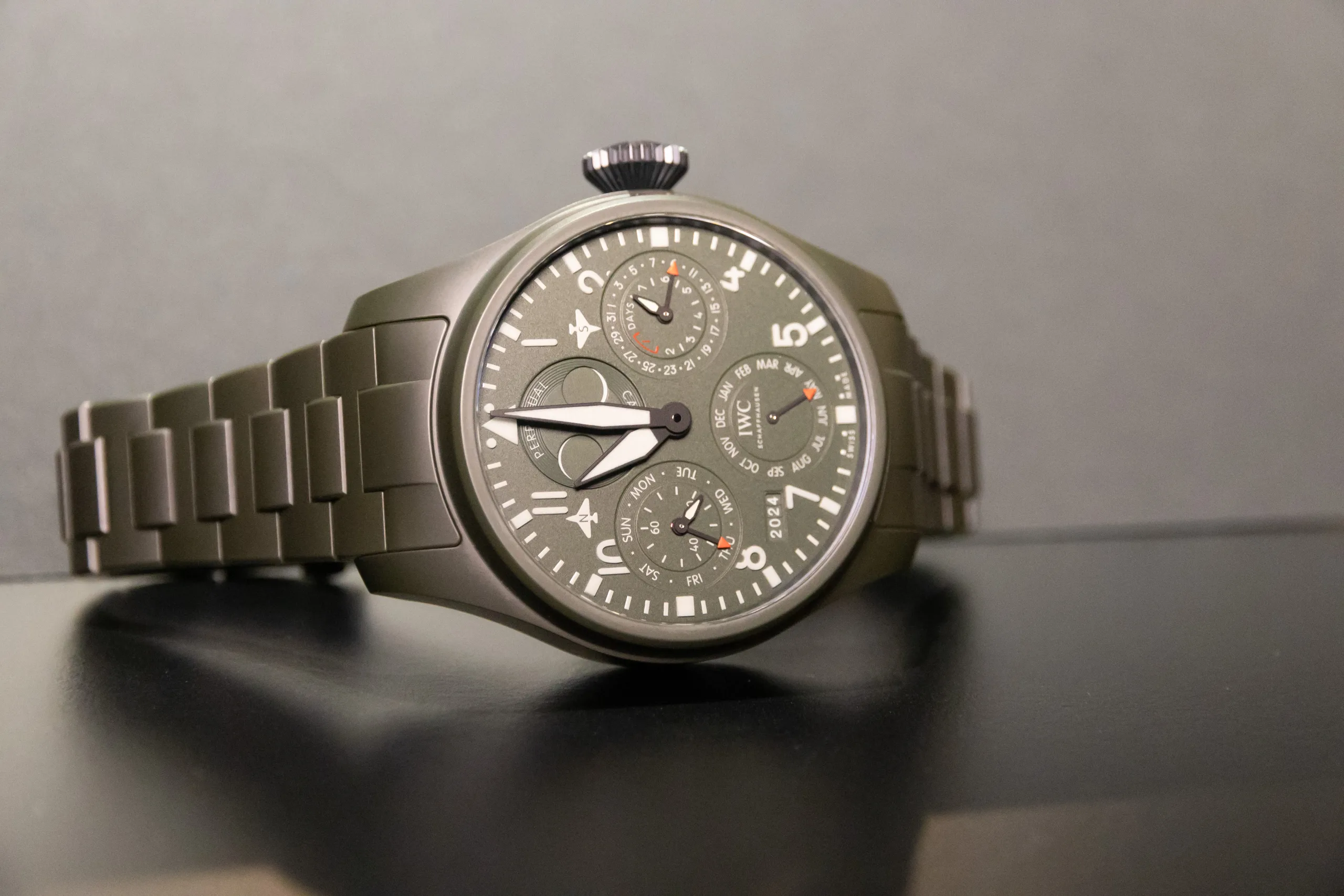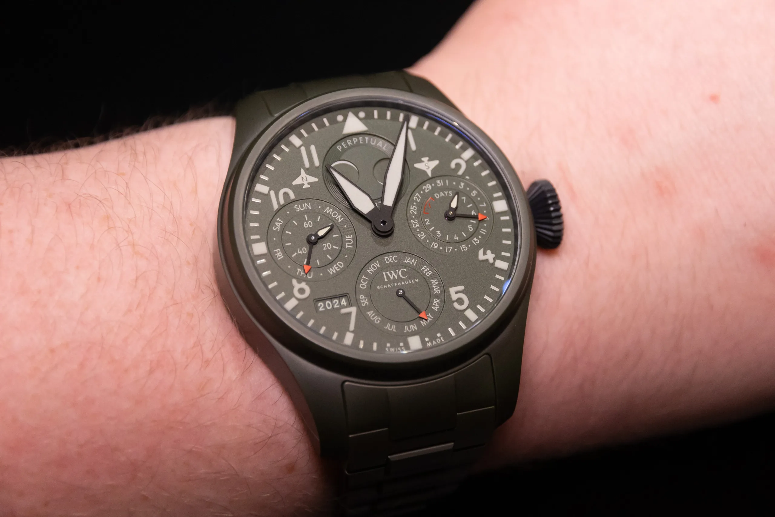 With that said, the only thing quiet or subtle about this watch is its launch. As you’ll see from the photos, this piece is a monster. At 46.5mm x 15.7mm, this watch is too big for my wrist, and it’s one of the only pieces at the show which was. You notice this thing all the time, but the ceramic case and ceramic bracelet, which IWC laboured for a long time to create, do help the wearing experience. The big crown is also obvious, but necessary. While it’s easy for me to talk about how big and, quite frankly, cumbersome this watch is, its intended purpose is as a pilot’s tool. Well, in theory, it makes sense, it’s big and legible, which, thanks to luminescent everything, means it’s easily readable during the day and the night. It’s also 100m water resistant.