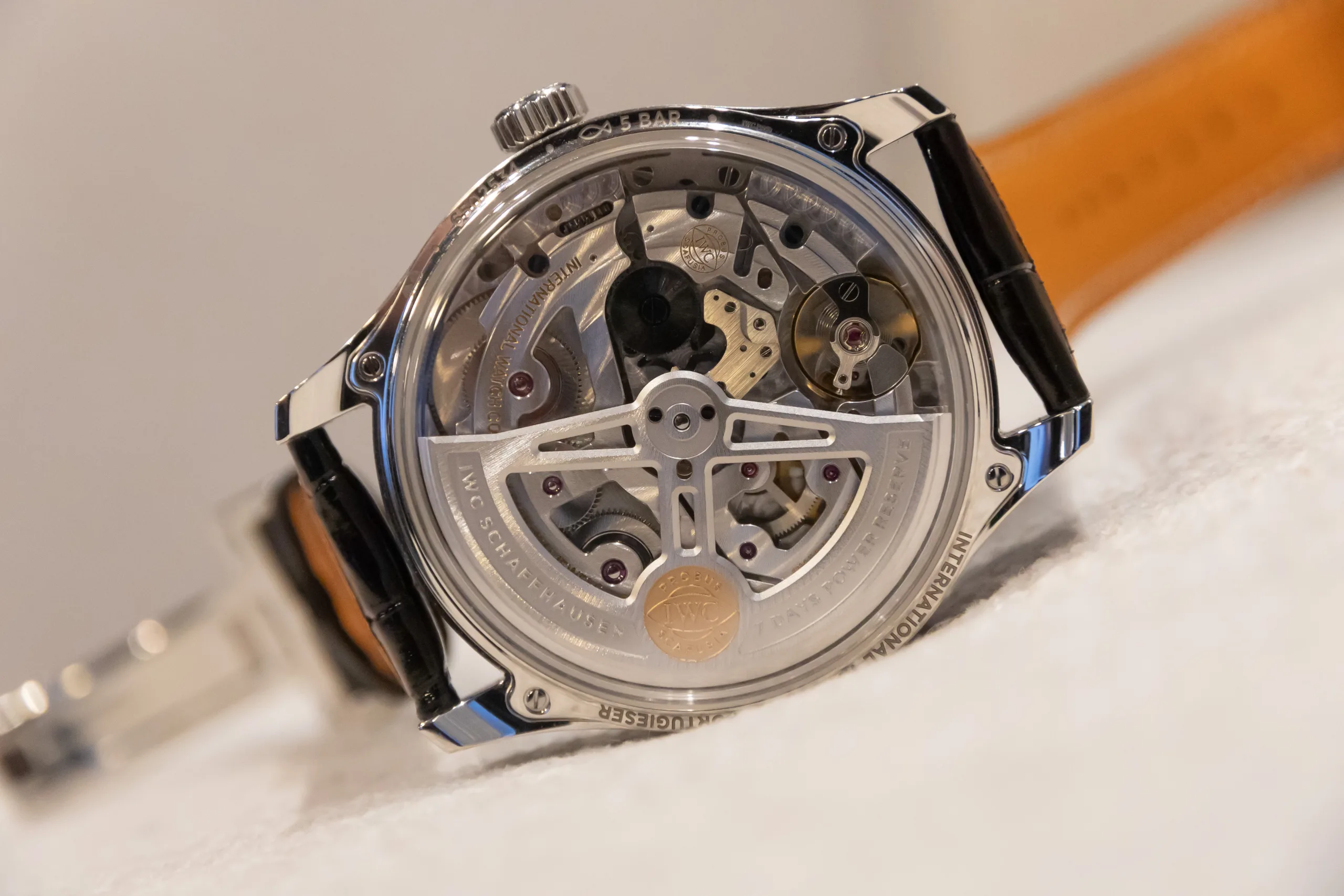 Around the back is the calibre 52640, which, like the dial, expands right to the case edge. Despite the complicated calendar system (which includes a year display as well as the usual accoutrements), IWC hasn’t distracted itself too much from what we really want from a mechanical watch, which is practicality. This movement has a 4Hz beat rate and a seven-day (168-hour) power reserve.