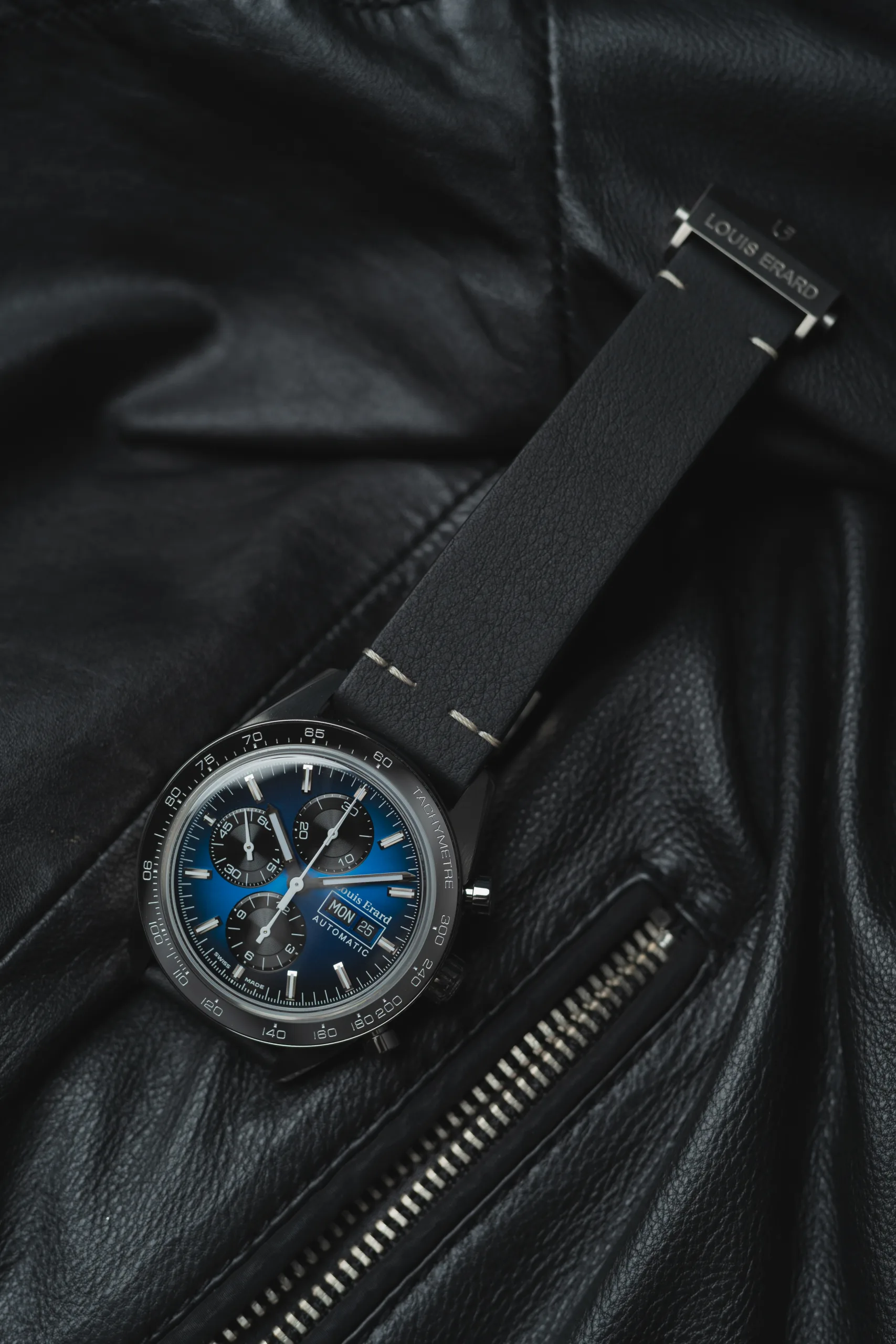 Every time I get a new watch in for review, it is the first glance at the dial that sets the general mood for the review. And I happy to say that my first face-to-face interaction with the La Sportive was sheer delight. Presented in a striking electric blue color, the dial looks striking and bold, however, what makes it special is the gradient effect. Starting from a vivid shade of blue at the center and culminating into a deep black color towards the outer periphery, this dial is quite dynamic and can look quite different in different lighting conditions. Placed on top of the dial are polished rectangular indices that reflect light quite well. Furthermore, the indices along with the baton-style hour and minute hand have been filled with luminous paint to ensure good legibility in dimply lit situations. Speaking of legibility, I never faced any difficulty in reading the time on this watch, one of the reasons for which I believe is the well-proportioned handset. The hour hand just falls just short of the hour markers whereas the minute hand reaches out to the end of the minute markings, making it a breeze to tell the time. As this is a chronograph, we have sub-registers that have been presented in black and have been positioned at 6, 9, and 12, a layout which is found on almost all Valjoux 7750 driven watches. The register at 6 keeps track of chronograph hours, the one at 9 tracks the running seconds, and the one at 12 tracks the chronograph minutes. All registers are nicely sunken and feature circular graining at the center, a small detail that I appreciate. The hands on all the registers are tapering sticks and have been painted white to provide a nice contrast to the black background. And finally, to complete the dial there is a nicely bordered day-date window at the 3 o’clock position. While the dial looks perfect, if I were asked to change anything, I would replace the Louis Erard branding with the one found on the Excellence Petite Seconde I reviewed earlier.