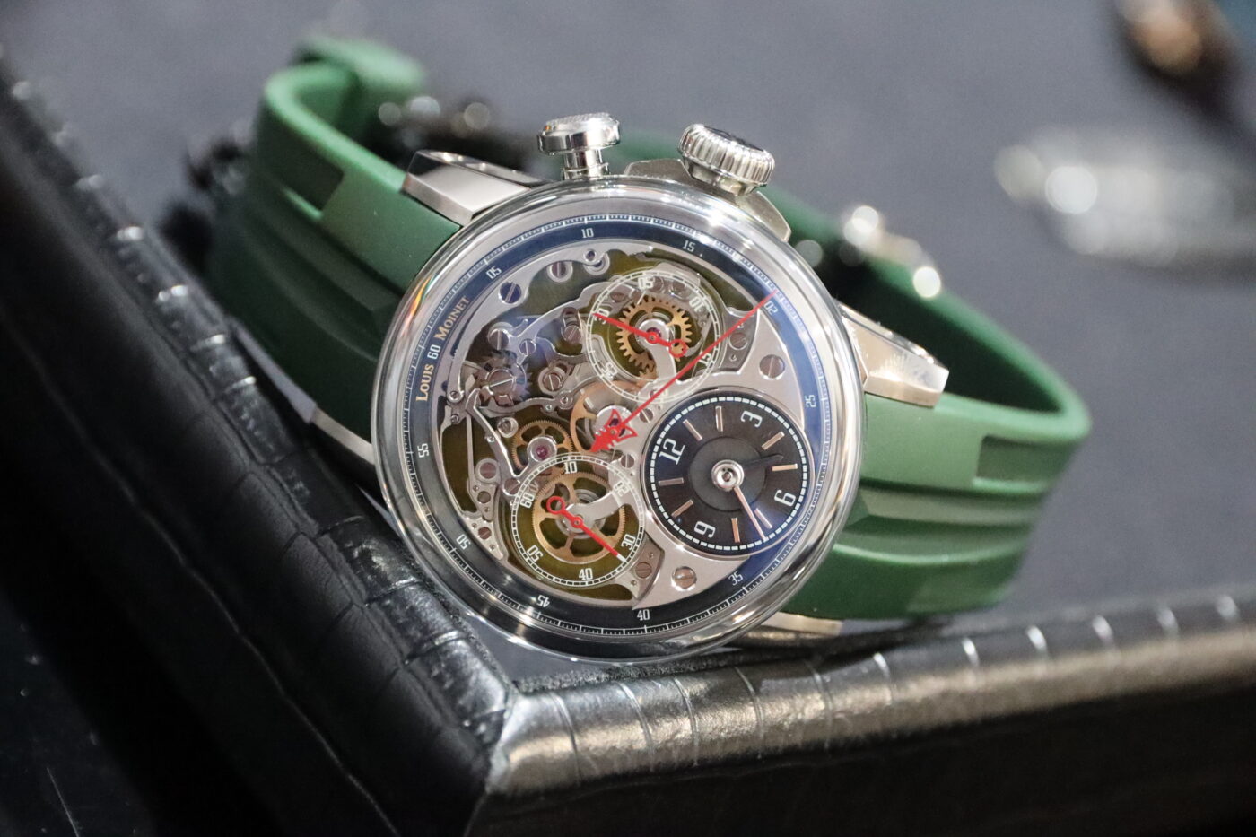 While the watch seems quite similar to the others, having all these extra complexities and keeping the watch recognisable is no easy feat, it’s not the case that Louis Moinet can slot in bits and bobs at their leisure and have them all work, the effort is commendable. The watch you’re looking at is a special version of the IMPULSION, there are 28 examples with a black mainplate, 28 examples with an aventurine mainplate but only 3 examples with an orange mainplate and contrasting yellow hands. The orange and yellow are quite wild, however, they still combine well on the dial to make this a very pleasant experience. The manually-wound calibre LM114, made in partnership with Concepto, looks beautiful from the front and the back. It has a 96-hour power reserve, too. It’s mounted in a unique case of 18k red gold combined with blue grade 5 titanium, it measures 42.5mm across. Louis Moinet might be an old-school name in watchmaking, but this proves that the brand is very forward-thinking in terms of design. Like the other watches, it’s a pleasure to wear and interact with the chronograph. Before taxes, the price is CHF 130,000.