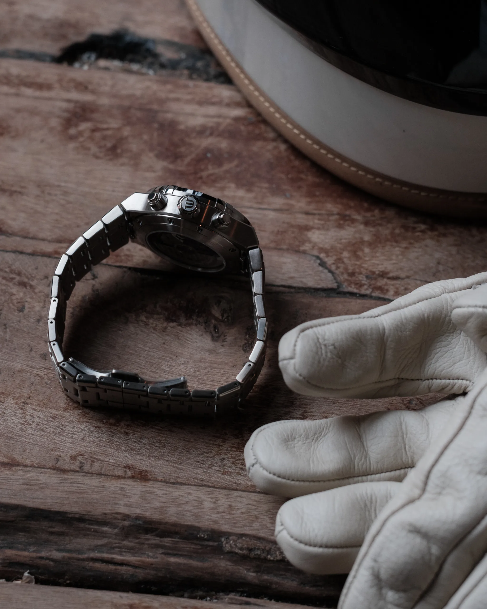 Now, let’s get one thing straight. This isn’t a minimalist’s chronograph. It’s thick, it’s architectural and it announces itself. But it never feels bloated. That’s an important distinction. On the wrist, it leans sporty in character, though never crosses into anything unruly or half baked. There’s restraint in the way it wears. Refined but not precious. You could wear it with a jacket sure, but I suspect it’d feel more at home peeking out from under a cuff on the sidelines of a weekend match or while navigating city streets on a brisk autumn morning. Titanium’s hypoallergenic nature and lightweight feel make it an easy all day companion; no wrist fatigue, no sticky hot spots.