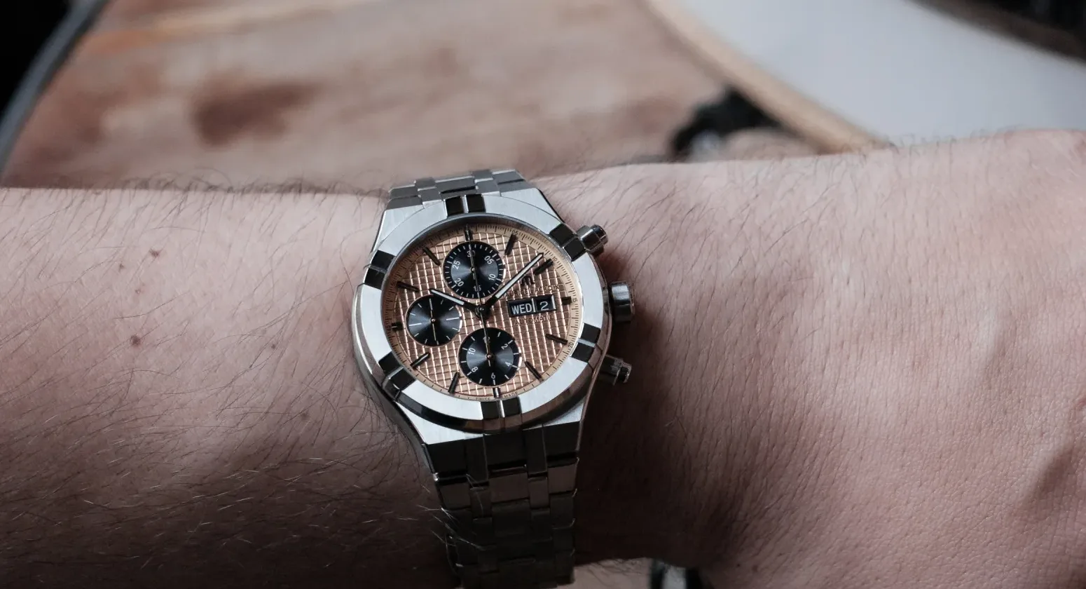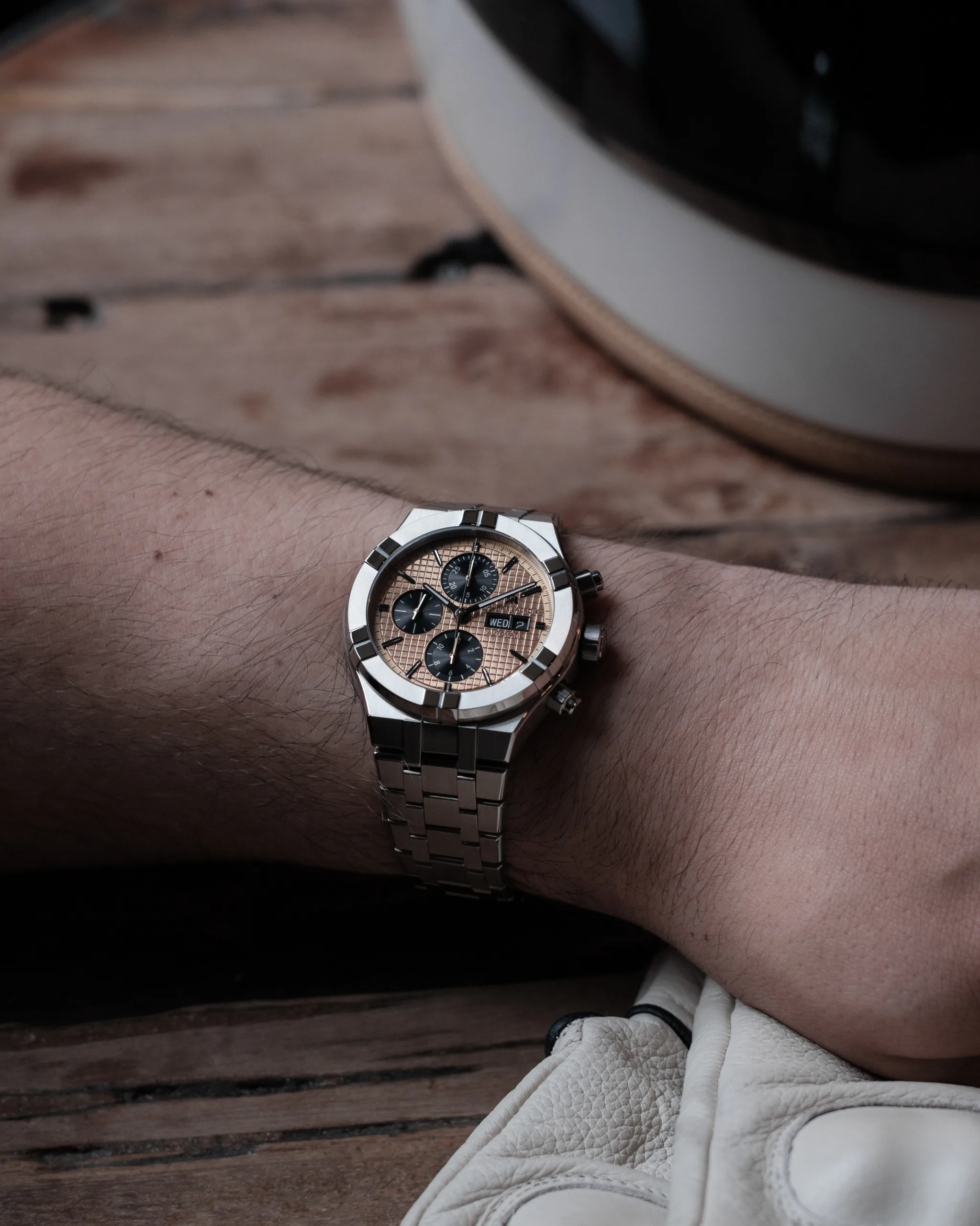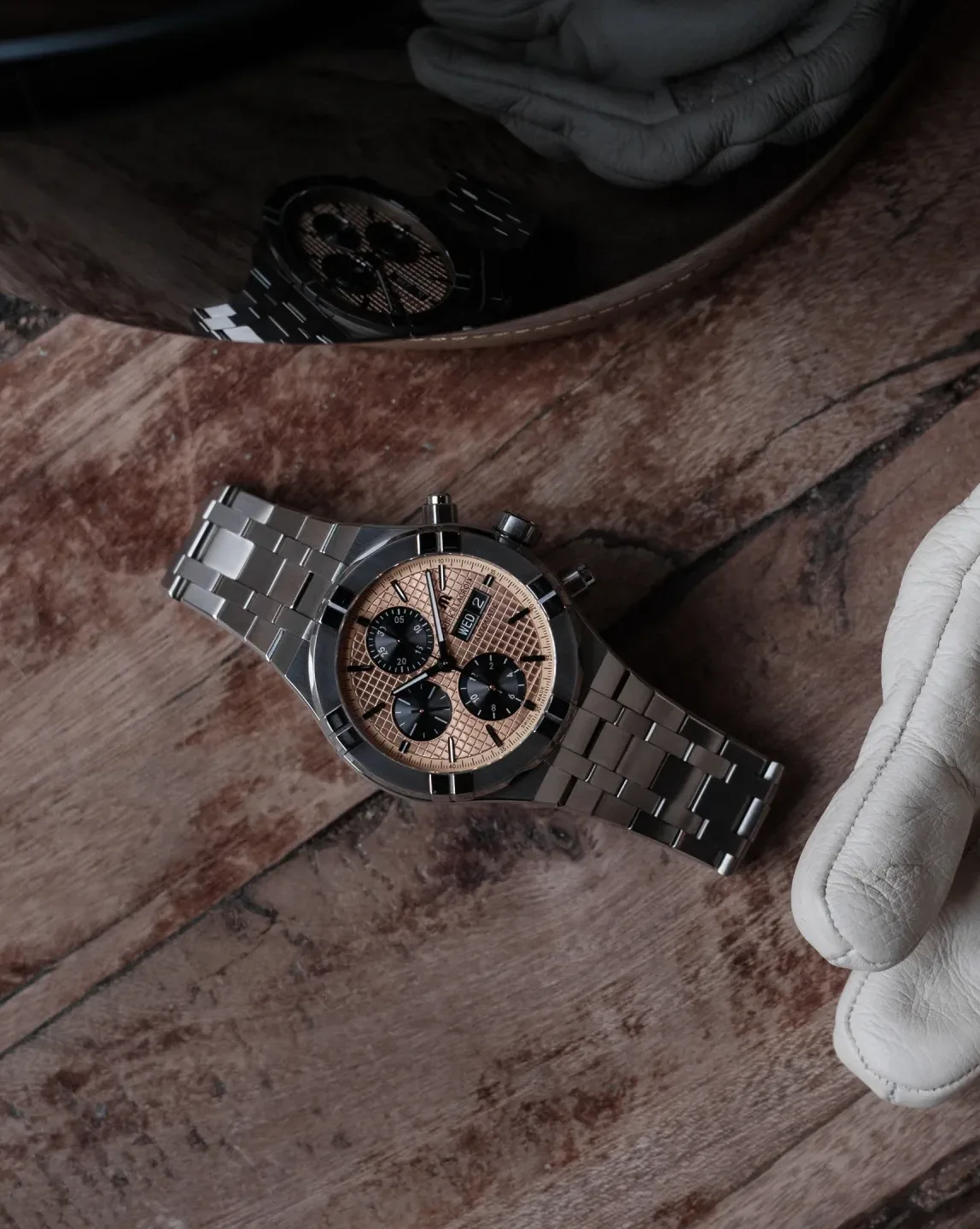 The dial is where things take an unexpected, but not an unwelcome turn. It has the gold toned square motif, a sort of embossed geometric pattern that adds a touch of architectural modernism to the layout and it has a sunray brushing that plays beautifully against the three snailed subdials. They’re slightly recessed, sharply contrasted and arranged in the classic 6-9-12 layout; 30-minute counter at 12, 12-hour totalizer at 6 and running seconds at 9. They’re either blue or black depending on the reference, but both versions nail the legibility bit. The applied polished rhodium indices are razor sharp and generously filled with Super-LumiNova, as are the hour and minute hands. Low light readability is genuinely solid. Dial has that stacked deck visual effect that makes it more interesting the longer you look at it. The day-date display at 3 o’clock integrates into the symmetry with admirable restraint. It doesn’t interrupt the flow; if anything, it balances the dial. What struck me most though, is how the mix of textures, raised pattern, sunburst base and those snailing counters give the whole dial a bit of architectural depth. It feels muscular, masculine and very much “of the now” without leaning into gimmickry.