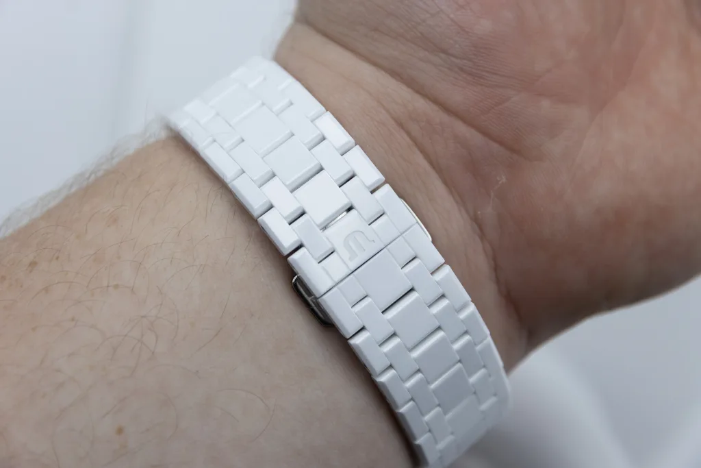 The ceramic bracelet has been finished well with no sharp edges left over, and the neither the case corners nor the crown dig in to my wrists.