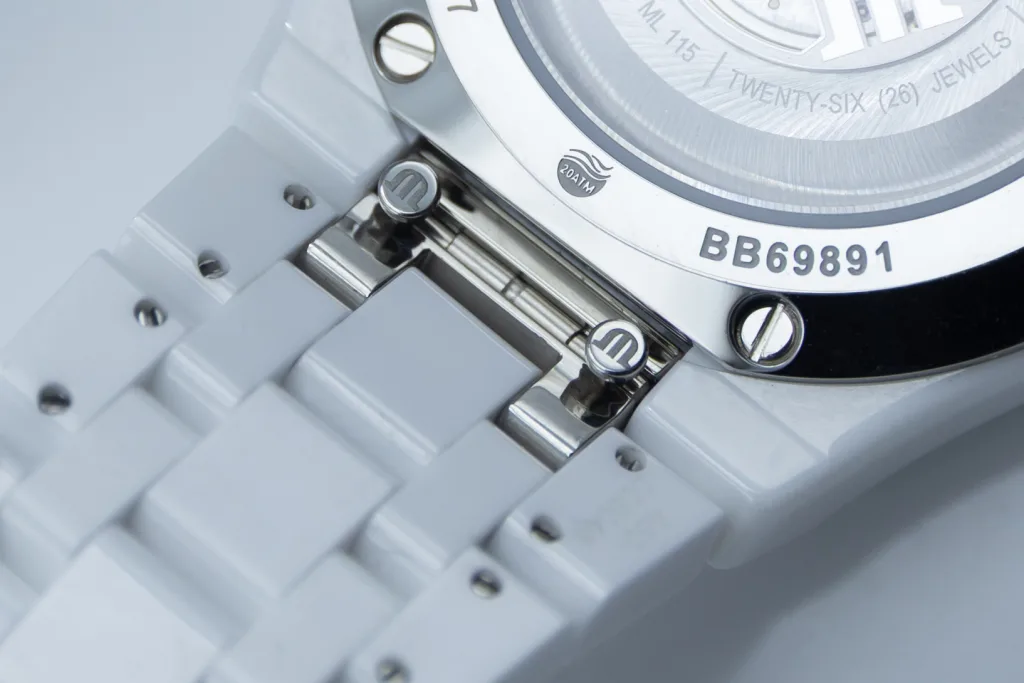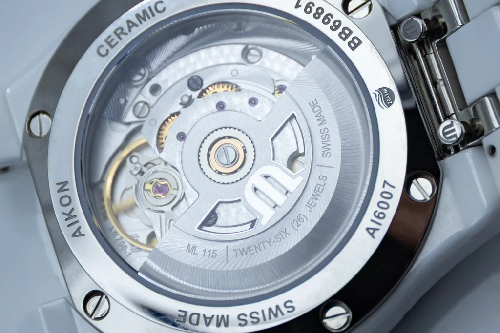 When looking at the caseback you’ll also be able to spot the quick change system Maurice Lacroix has built into it. The easy change system allows you to do as the name suggests and easily change the bracelet on the watch for something else, like a strap. In this case, straps are optional extras. Maurice Lacroix makes a fair number of different strap options and any strap designed for watches with a reference number beginning with AI6007, as this watch’s reference does, will fit. The issue with this particular version of the Aikon is that the strap options on their website are clearly designed for stainless steel watches, given the steel buckles and steel end links, which is kind of funny in a way. You could do something really nuts, like put a stainless steel bracelet on your ceramic-cased watch if you wanted!