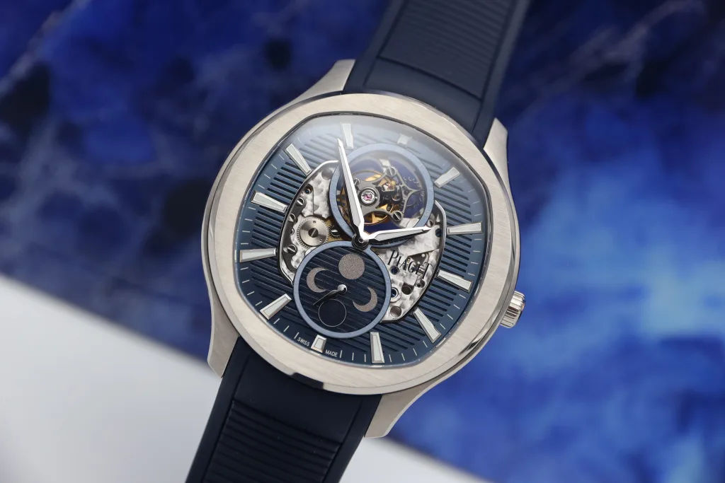 Reading the time is very easy. The large silvery hands (with lume) stand out over the dial, which has a cutout to see part of the movement. The moonphase is clear, too. The only part that’s hard to focus on in person is the Piaget name printed on the underside of the crystal, but it’s hardly relevant if the name on the dial is almost invisible. That is, unless you’re one of those people, and if you are, the Piaget name is inscribed on the rubber strap.