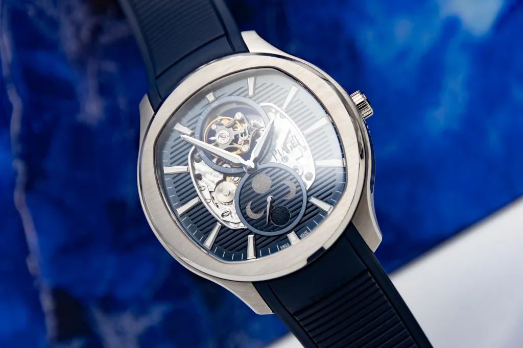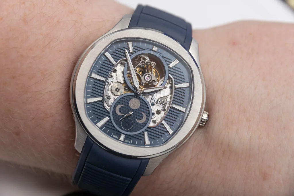 The light and slim case is supremely comfortable as long as your wrists can support the watch’s diameter. The blue rubber strap is of very high quality and, honestly, one of the nicest I’ve tried. Thanks to a quick-change system, you can interchange it with other Piaget straps.