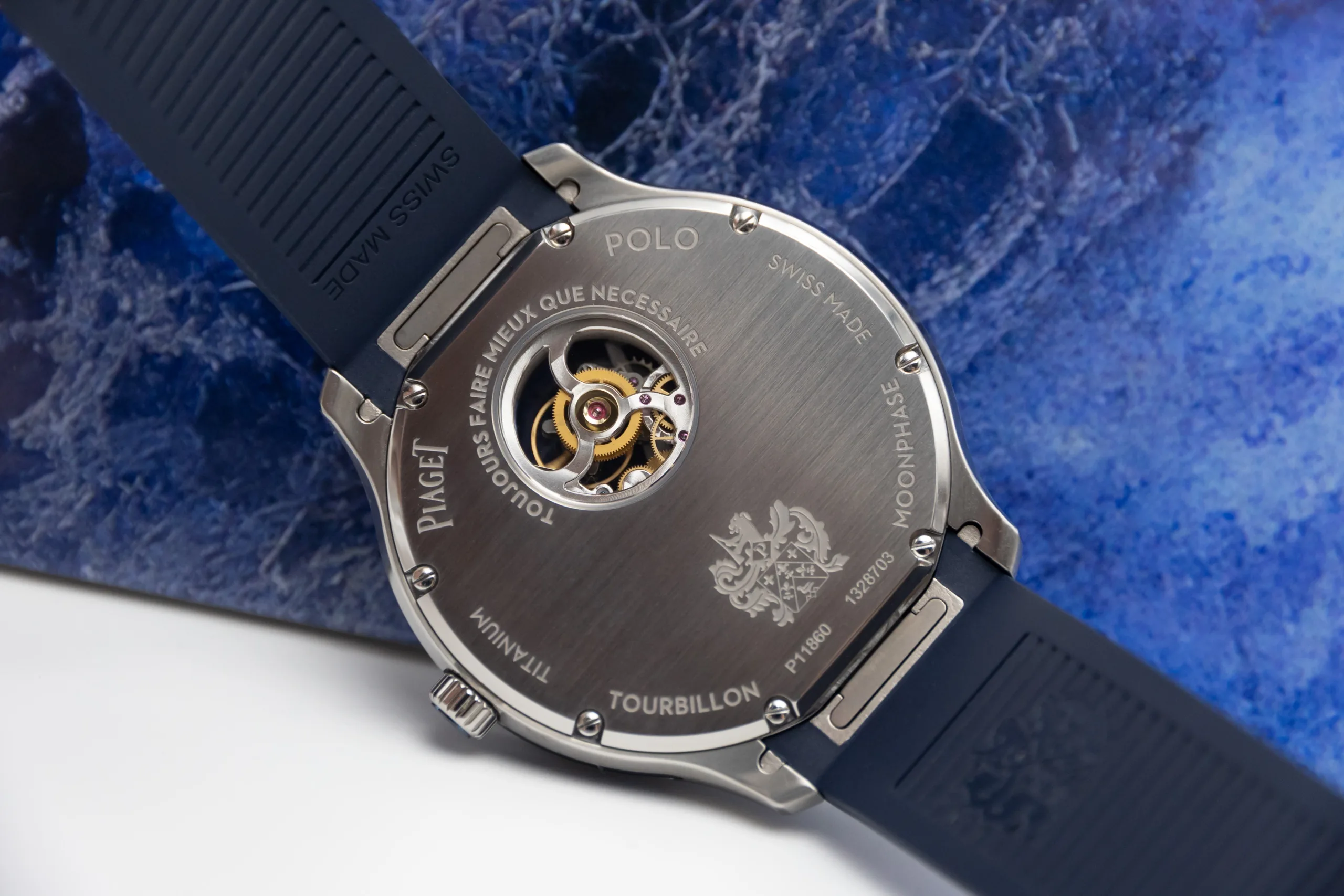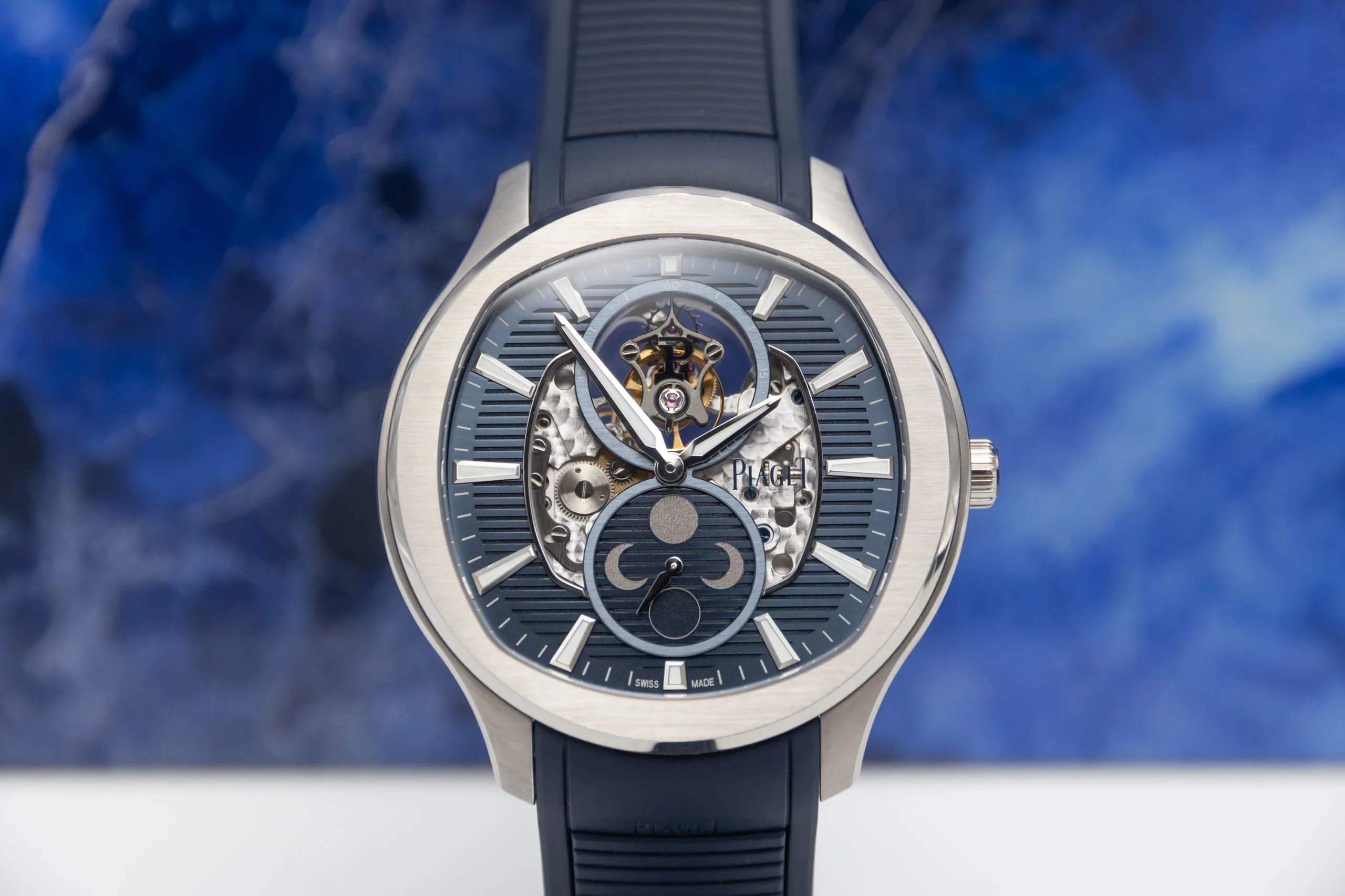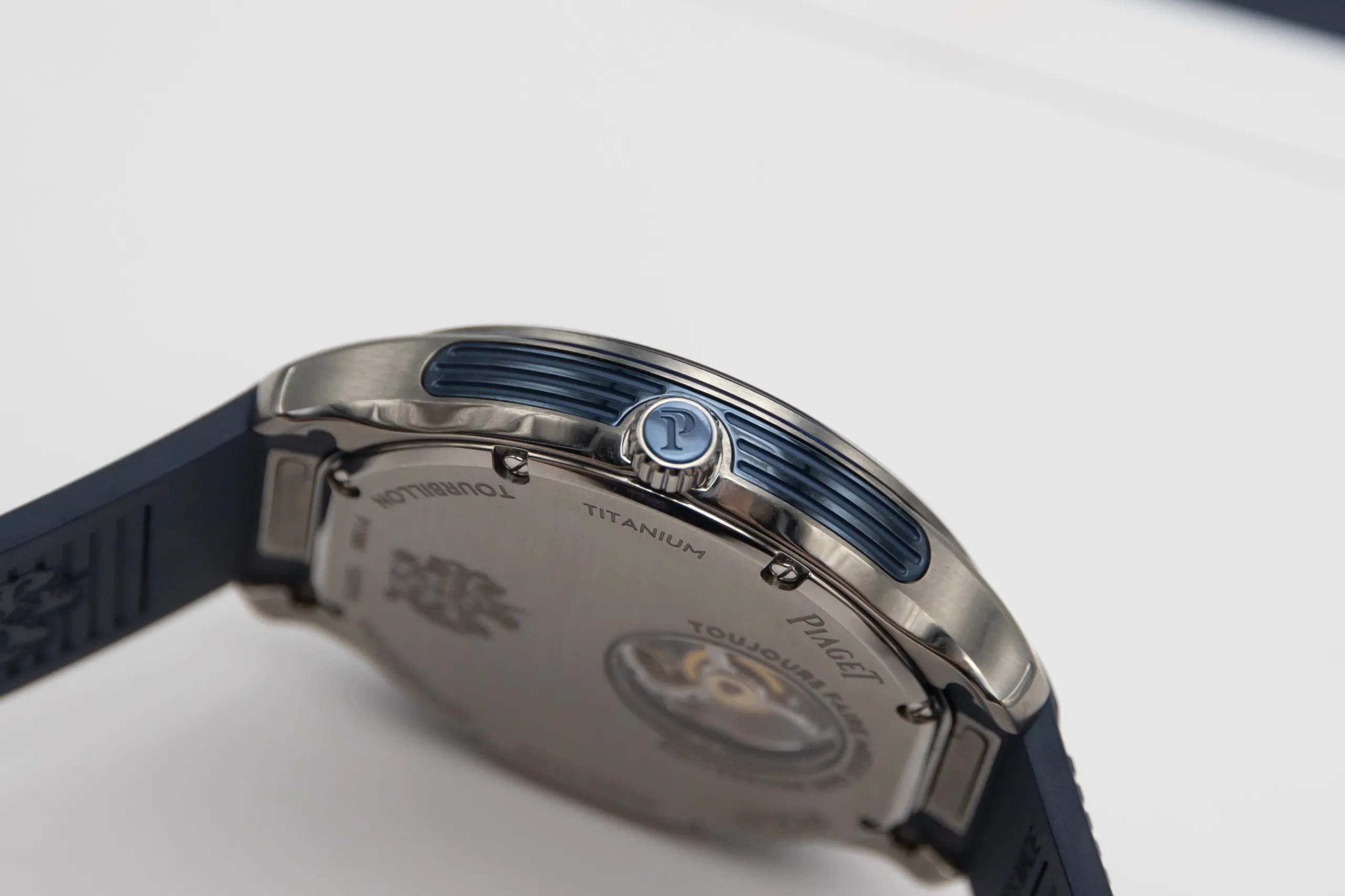 The light and slim case is supremely comfortable as long as your wrists can support the watch’s diameter. The blue rubber strap is of very high quality and, honestly, one of the nicest I’ve tried. Thanks to a quick-change system, you can interchange it with other Piaget straps.