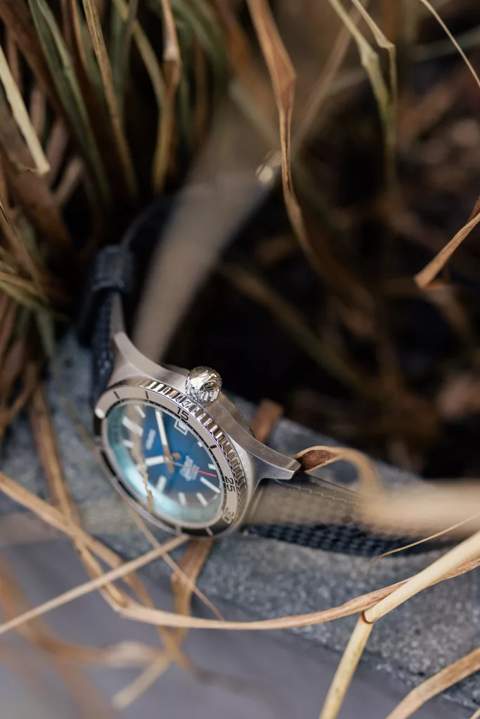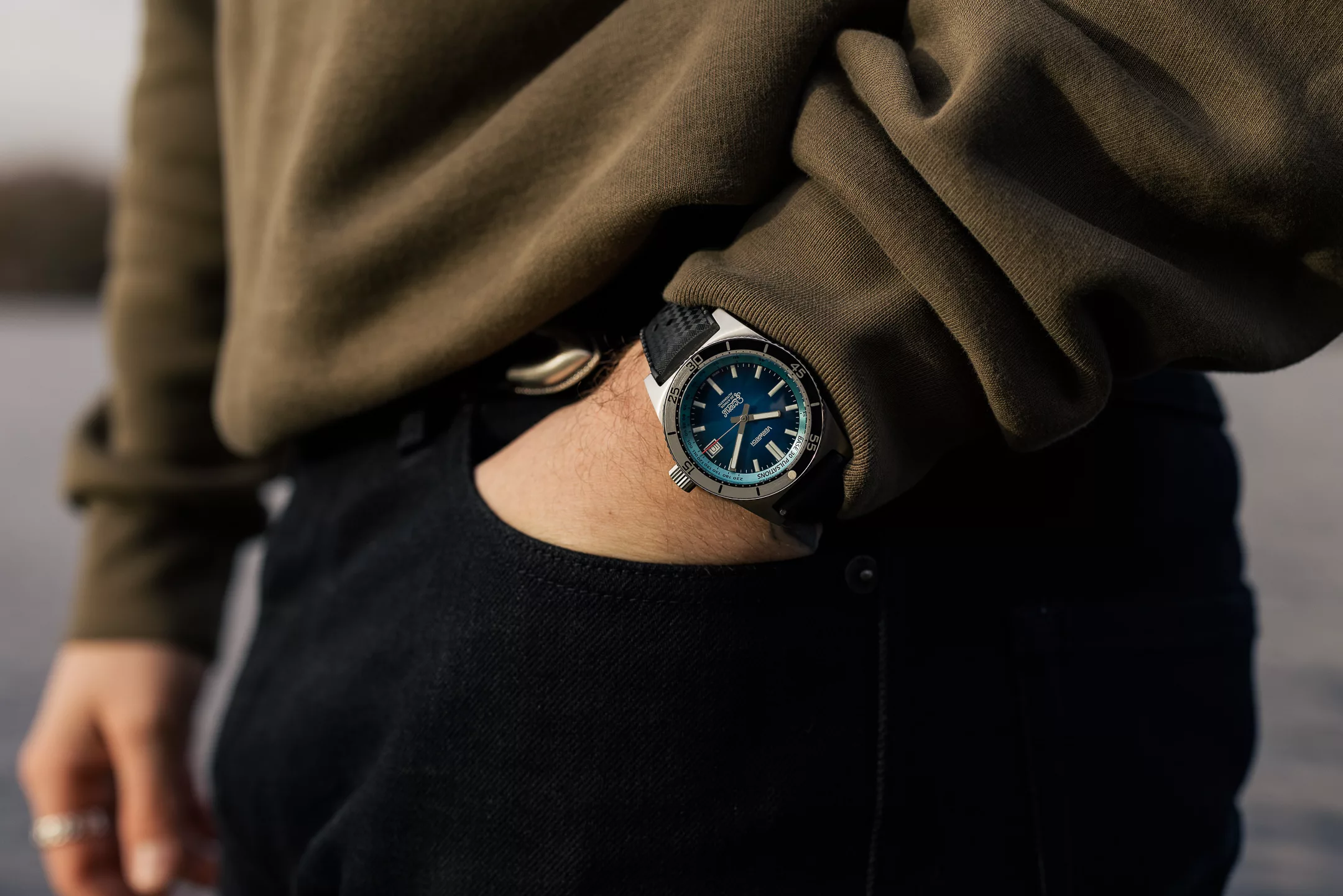But the true heart of any diver is its dial, and this Gradient Blue beauty throws down the gauntlet for attention. It’s a mesmerizing dance of color, starting at the center with a deep, almost mesmerizing sapphire blue, the kind that reminds you of staring into the Mariana Trench at high noon. As the light catches it, the color subtly shifts, morphing into a rich, inky navy as it climbs the dial. Then, just before the edge, it takes a final, unexpected twist, transitioning into the faintest whisper of an azure that wouldn’t be out of place on a clear summer sky. The way the color changes is tricky, and it looks different depending on how you hold it. It’s almost like looking into an ocean where there’s no uniformity of colors, one that keeps surprising you with its shades of blue. It’s cool, you could forget to check the time because you’re too busy staring at it. The baton hands, filled with Super-LumiNova BGW9, slice through the blue, their stark white a reassuring beacon in low light. The pulsometer scale, nestled on an anodized blue aluminum ring, lends an air of tool-watch cool, while the red-tipped seconds hand adds a playful dash of color.