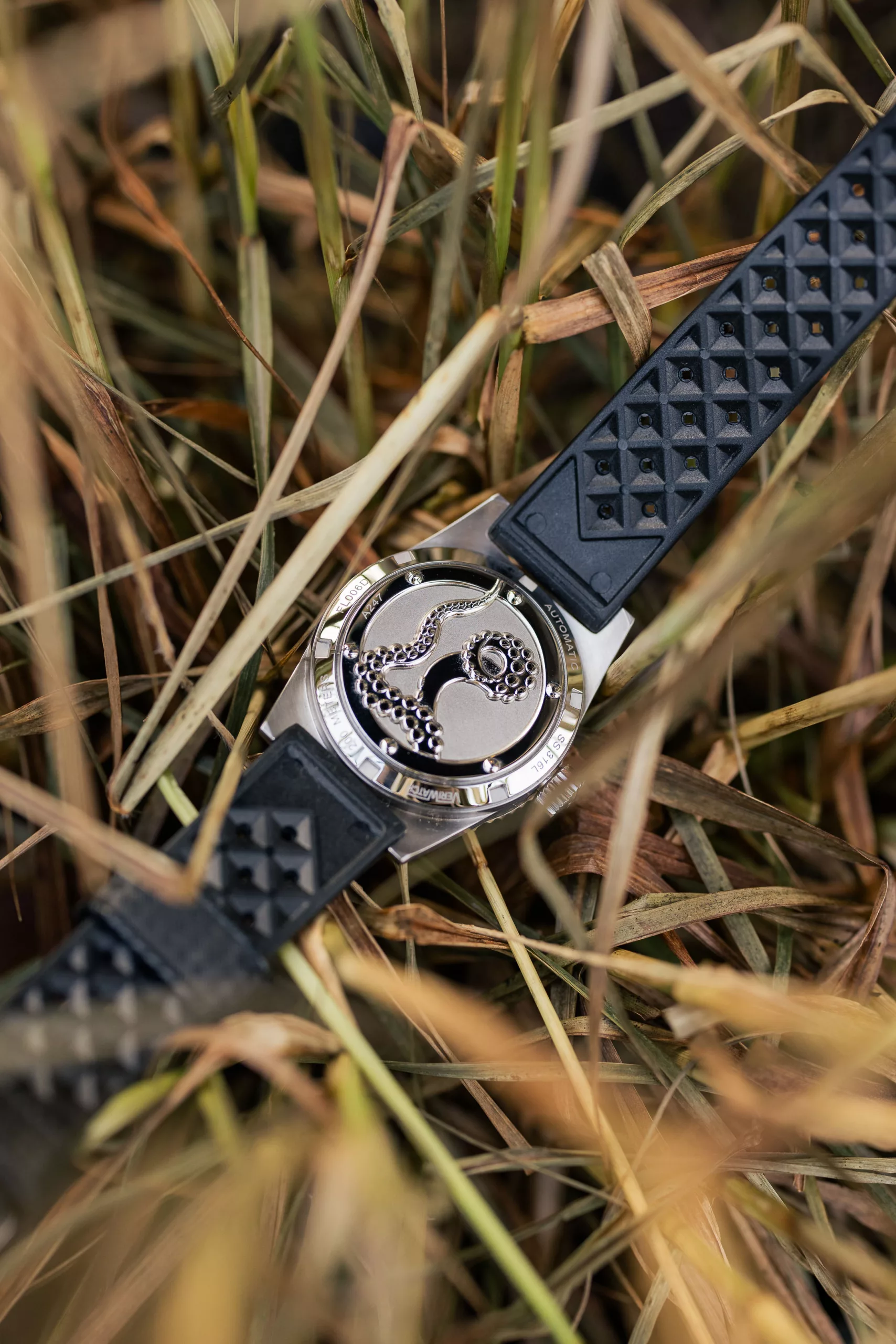 Exuding the cool confidence of the 70s, the 38mm case is made from gleaming 316L stainless steel and features subdued dimensions. It’s the perfect size for most wrists, not too bulky, yet undeniably present. The tonneau curves and squared-off lugs hug the wrist comfortably, while the screw-down crown, emblazoned with a double O-ring, promises depths beyond the pool. What truly catches the eye, however, is the caseback. Two octopus tentacles, rendered in textured relief, dance across the metal, a subtle yet delightful detail that speaks volumes about VeriWatch’s commitment to storytelling.
