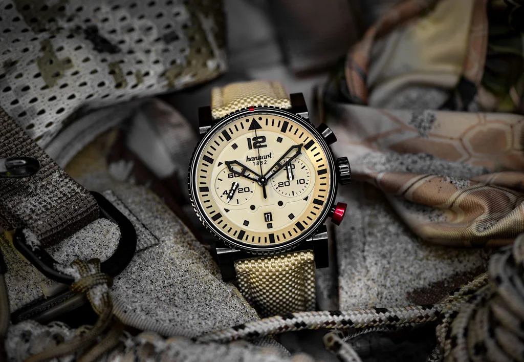 The new Hanhart Primus Desert Pilot Dark comes attached to a sand-colored textile strap and will also come packaged with a Vulkanus Hornet utility knife. The production run is limited to just 100 pieces, and the retail price has been set at EUR 3,090.