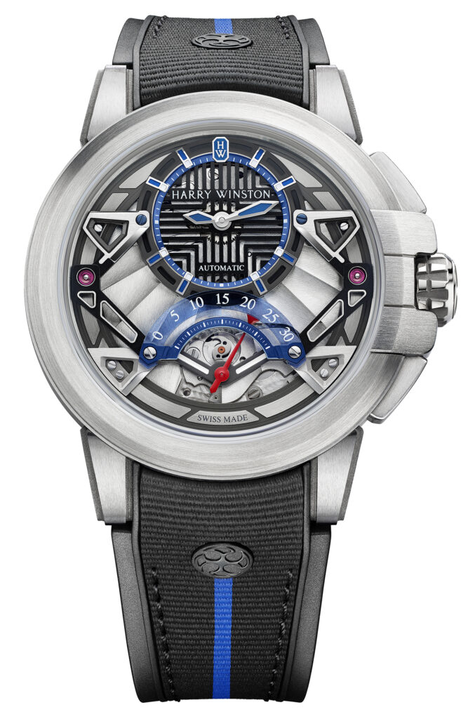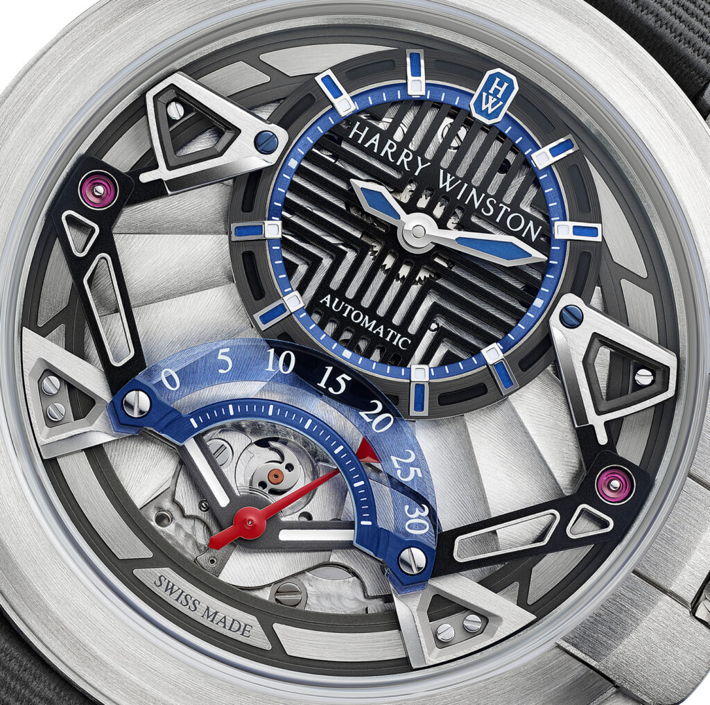 The primary time dial at 12 O’clock features blue contrasting a black backdrop with lines cut out of it for a somewhat art deco design. Short sword hands filled with blue indicate the time on a blue chapter ring with blue markers and the Harry Winston logo at 12 O’clock. Below the time dial is a retrograde seconds indicator with numbers printed on a blue transparent piece of sapphire crystal that evokes the arch over the brand’s flagship boutique in New York. The seconds hand is painted red and goes up to 30 seconds before jumping back and starting all over again.