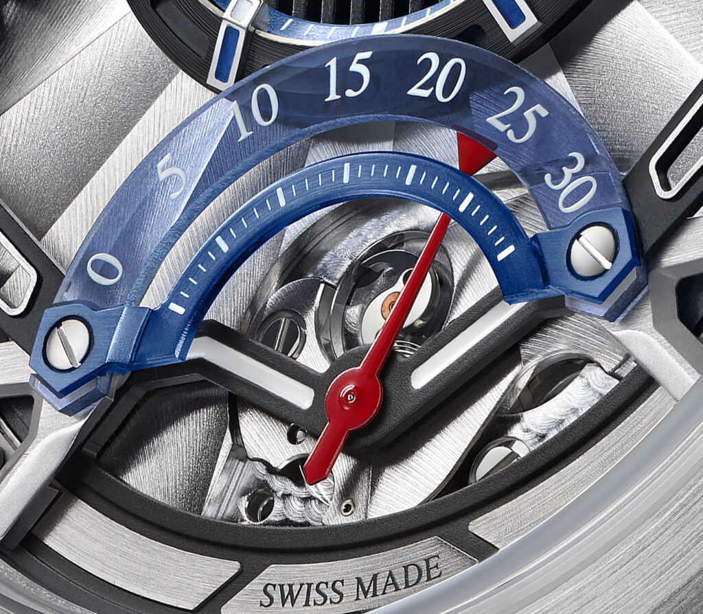 The watch’s dial has been partially skeletonised. A baseplate with côtes de Genève finishing radiating from the time dial obscures a full view of the movement, but a series of skeletonised bridge supports in different colours and finishes makes for a visually attractive appearance.