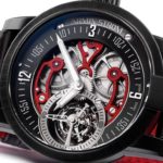 The movement is DLC treated, with a skeletonized chronograph module are clearly visible beneath the Super Luminova hands, pointing to the hours and minutes marked on the flange, and gives a great legibility of the time. A skeletonized date disk turns steadily in order to clearly display the date at 12 o’clock.