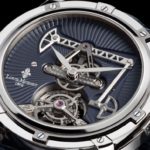 The 44 mm Zalium case frames an open-worked three-dimensional smoked blue sapphire dial, with a blue minute subdial and a matt blue flange that gives an depth to the time functions.