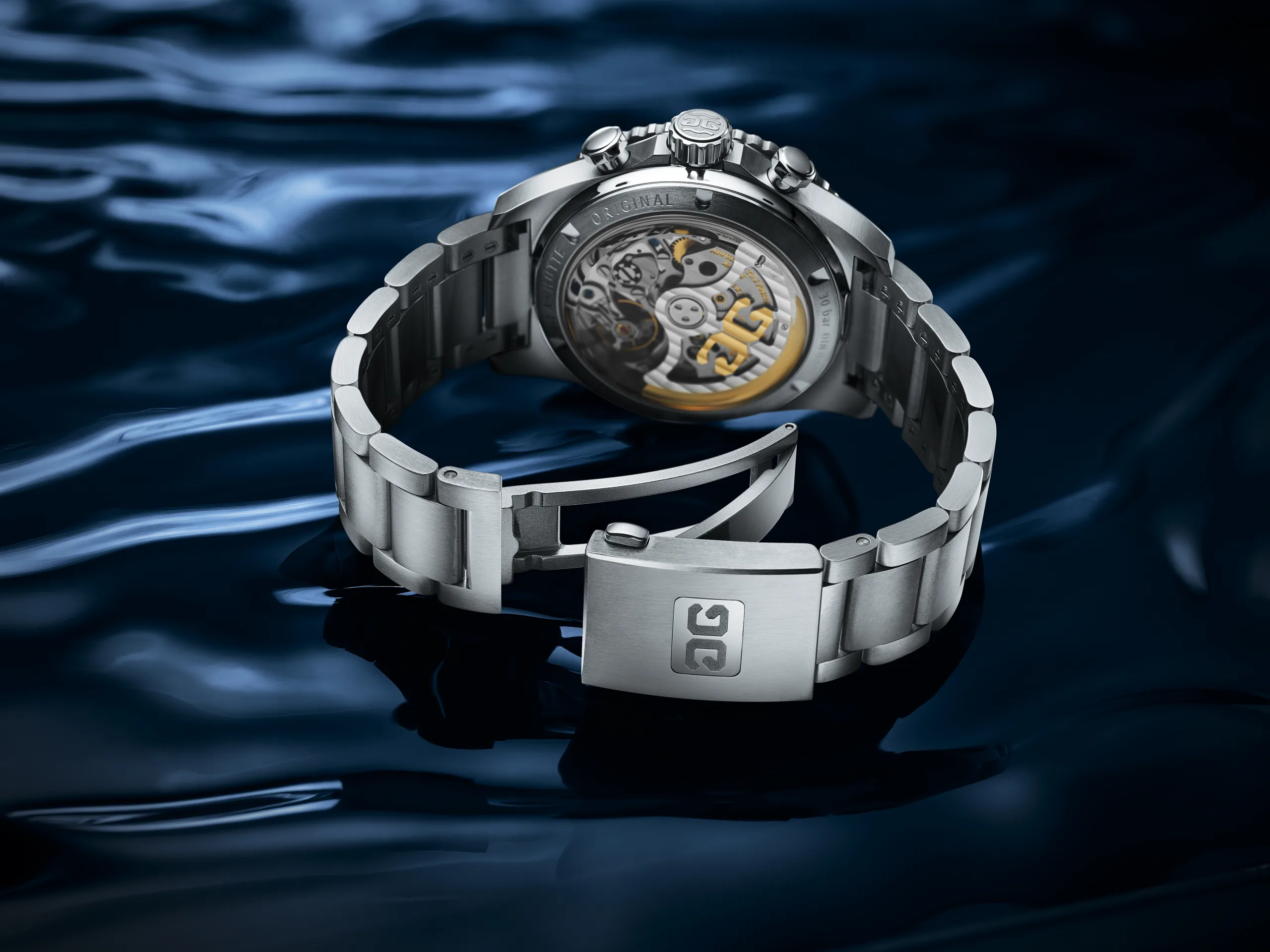 The SeaQ model is not just a standalone timepiece but a foundation for future innovations. Imagine a tourbillon diving watch or a perpetual calendar watch that’s as accurate at 300m below as it is on the surface. While we wait for these possibilities, we have the SeaQ Chronograph, featuring a 30-minute flyback chronograph and a Panorama Date window. The elegantly-finished calibre 37-23 provides this watch with its complication, and it features all the accoutrements one would expect from a luxury watchmaker like Glashütte Original such as fine bevelling and polishing of its components, a silicone hairspring and a column wheel mechanism for precise control over the chronograph. It also has a long 70-hour power reserve. This is all wrapped up in a luxuriously finished stainless steel case measuring 43.20mm x 16.95mm, and it can be optioned with a range of fabric and rubber straps or a high-quality stainless steel bracelet.