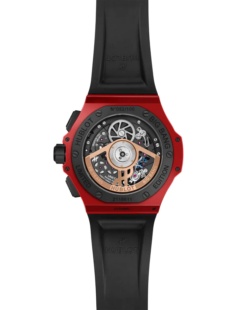 Hublot first introduced colored ceramic in 2018 with this exact shade of red. It sounds simple, but making ceramic hold a strong color without losing structure is no easy task. Colored ceramic is a serious technical challenge. Only a few brands can pull that off. This is Hublot showing something they actually developed through their own research, not borrowed tech. It has presence, confidence, and that instant wow factor.