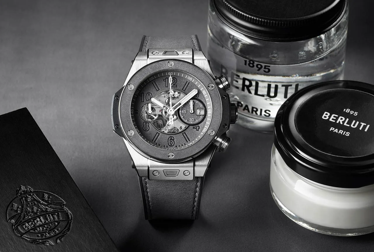 Back in 2016, Hublot partnered with a famed French leather-making house Berluti, which resulted in the creation of Hublot Classic Fusion. Following the collaboration, the two brands have paired on a number of occasions, which also led to the creation of Big Bang Unico Berluti Cold Brown last year. Now Hublot partners with Berluti again and the end result is a monochromatic watch with a strong element of leather in its design. The design of the new watch is roughly the same as the Cold Brown version, but the case is changed from black ceramic to silver-gray titanium, and the brown Venezia leather bezel and dial have also become cement-like gray. The shade that’s embellished on leather workings on the watch is developed by Berluti, it’s their emblematic Venezia leather featuring Aluminio, Berluti’s signature patina.