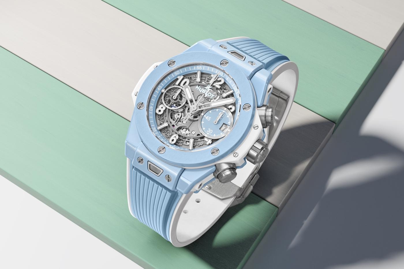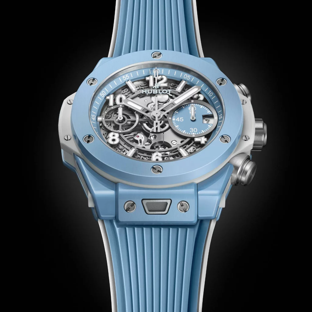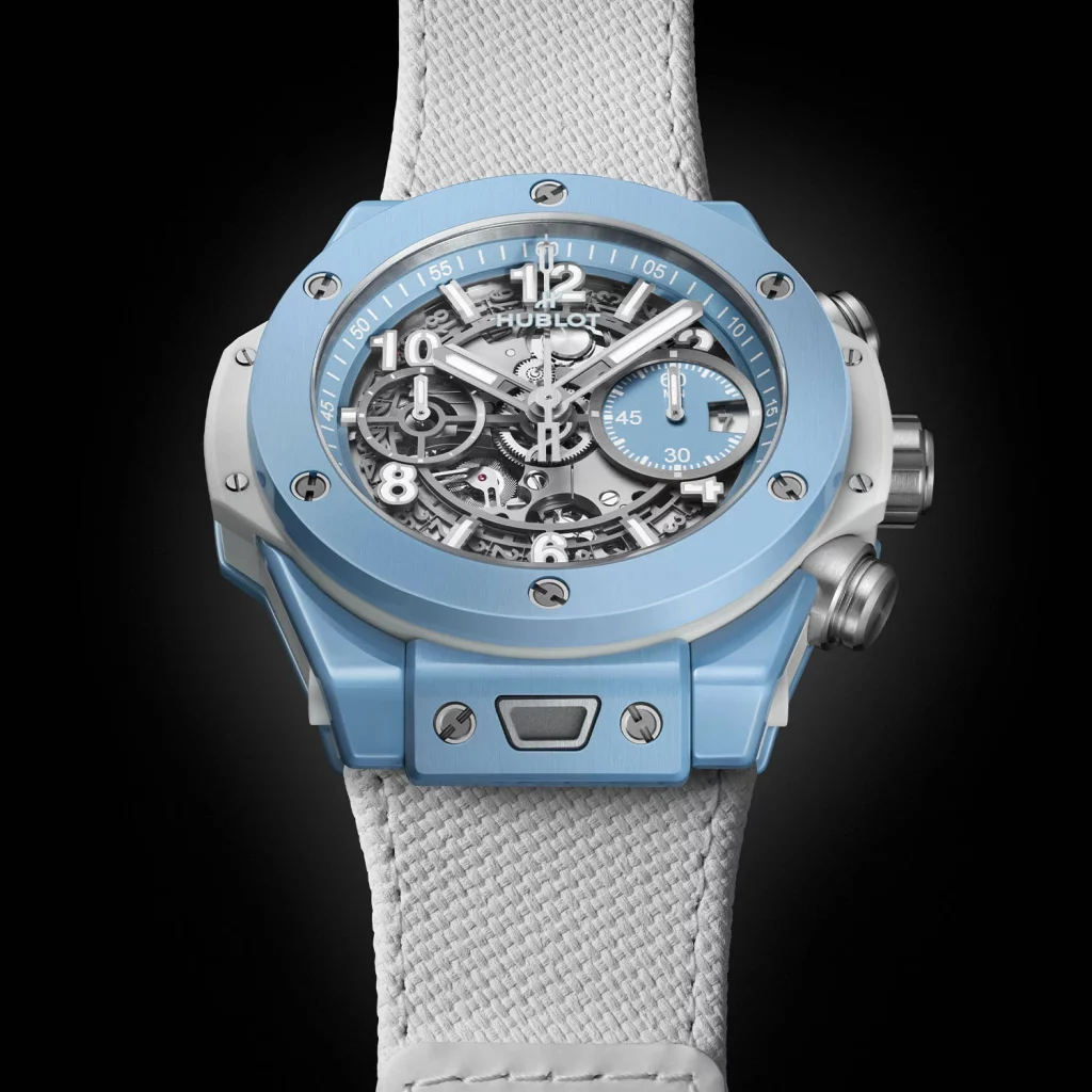The watch to get gussied up in colourful ceramic this time is the Big Bang Unico chronograph which is the same watch as the last two Summer Editions. Still, it’s a great watch to see in person, providing a great tactile experience in ceramic or metal (I’ve seen both in the past). With its ceramic case measuring 42mm x 14.5mm, this watch is quite compact. I will note, however, that the lugs with their unique quick change strap system, inspired by seatbelts in cars, make the watch quite long lug-to-lug, so it’s worth seeing in person to check that it suits. I can say that Hublot watches are generally very comfy on the wrist.