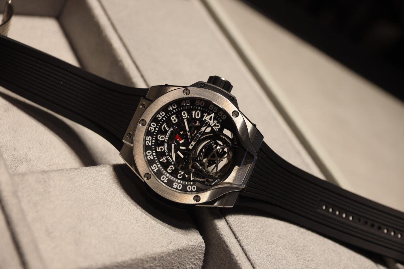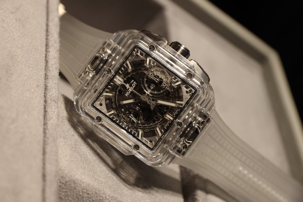 My personal favourite of the watches that I saw is the Square Bang Unico in sapphire crystal. At 42mm, it’s reasonably sized, it’s also very comfy thanks to the rubber strap which is translucent like the case. Of course, with a watch like this, the case is the main draw and it’s quite remarkable. Seeing all the different levers and wheels as they move when the chronograph is activated is quite something. You can also see the rubber gaskets used, I wonder if there’s a choice of colours for those, that would allow owners some interesting colour combinations. Then again, it’s not as if this watch isn’t interesting already, not only because of that awesome case but also because it’s one of the few Hublot watches that isn’t porthole shaped in some way, but it still has the “ears”. This watch features the in-house self-winding calibre HUB1280 with a column wheel chronograph with a flyback function and has a power reserve of 72 hours. Hublot hasn’t said this is a limited edition watch, but expect them to take their time making it. The price is 95,000 US$.