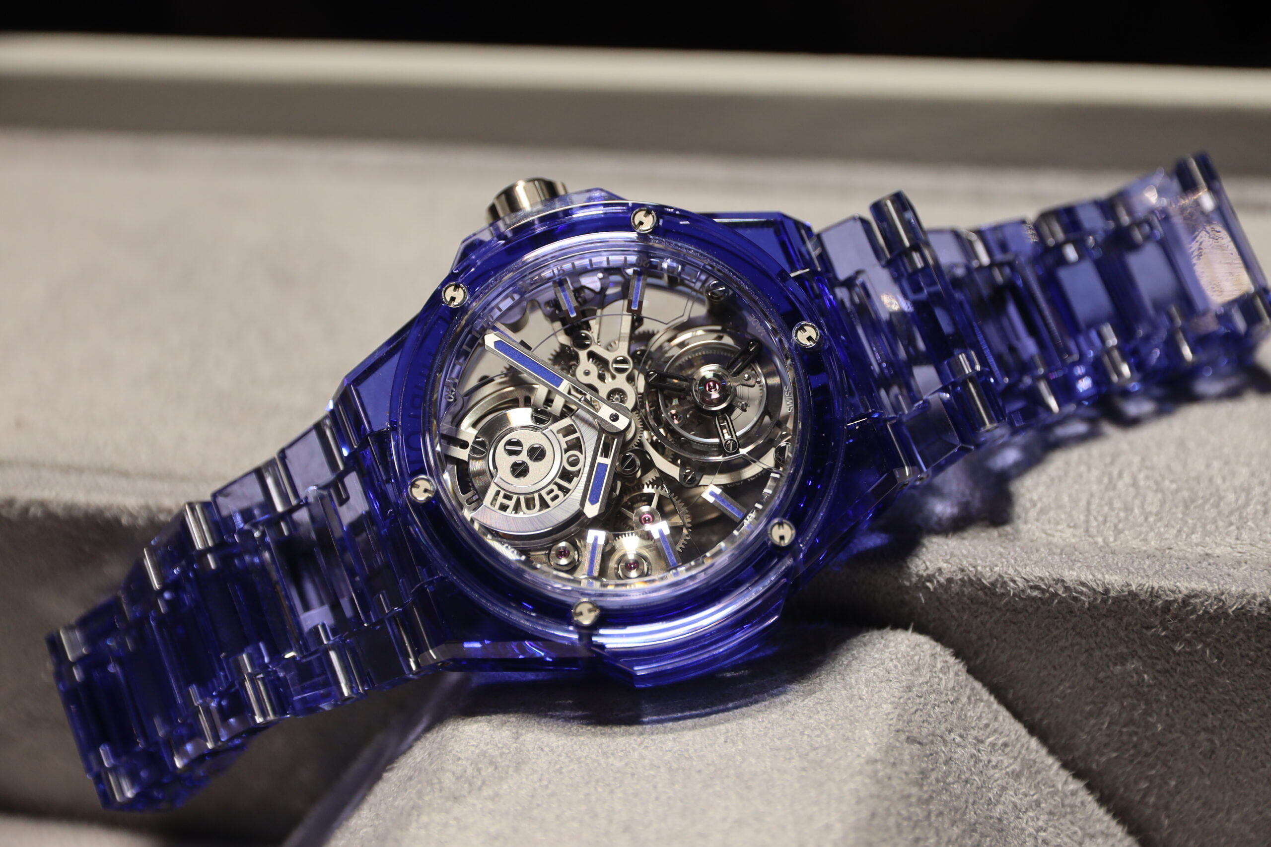 Undoubtedly the most eye-catching release this year, that I saw at least, was all sapphire all-blue Big Bang Integrated Tourbillon Full Blue Sapphire. Hublot has done many watches in sapphire crystal now, as can be seen above, but hardly any have a sapphire crystal bracelet as well. Partly, I expect, because that makes it ludicrously expensive, but also because it’s very difficult to do. Some parts are metal, of course, but the majority is the sapphire crystal which is lightweight and very strong. The watch felt light but sturdy, the edges on the bracelet are a little sharp but not unpleasant, and the dial with tourbillon and micro-rotor visible are eye-catching. The in-house made HUB6035 runs for a total of 72-hours and is on display from all angles, thanks to that case again. There will only be ten of these, and the price is an eye-watering 527,000 US$. It’s definitely not a watch to wear with a dinner suit, but I think with jeans and a blazer even, this could be a great piece for those who can afford it.