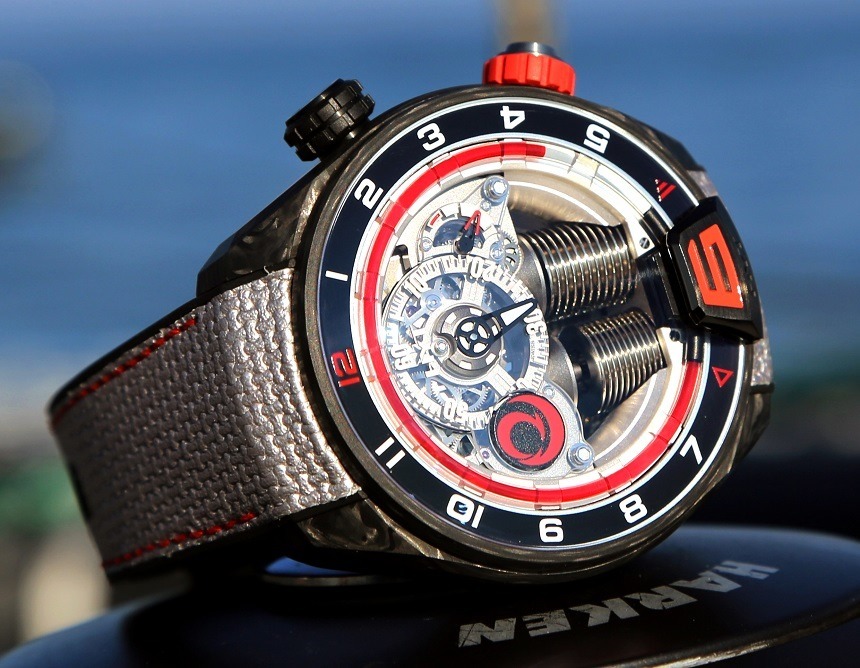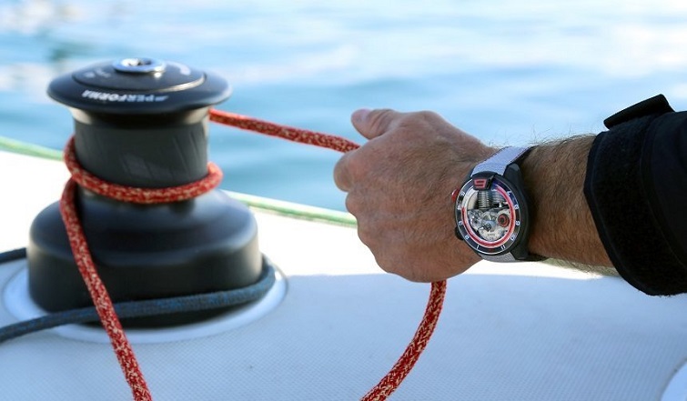 Again like the H1 we find their signature twin bellows that push the two liquids round to indicate the hours, with the customary minute dial at 12 O’clock which now has white inscriptions on the dial with the sub-second dial just offsetting it which is covered with the Alinghi racing logo, the sailing team that HYT sponsors. Also, HYT has changed the 12 numeral to red with the dome at 6 O’clock also now in red lacquer. The strap is also new on this special edition which is now a black rubber base with stunning integrated silver sail canvas and red stitching.