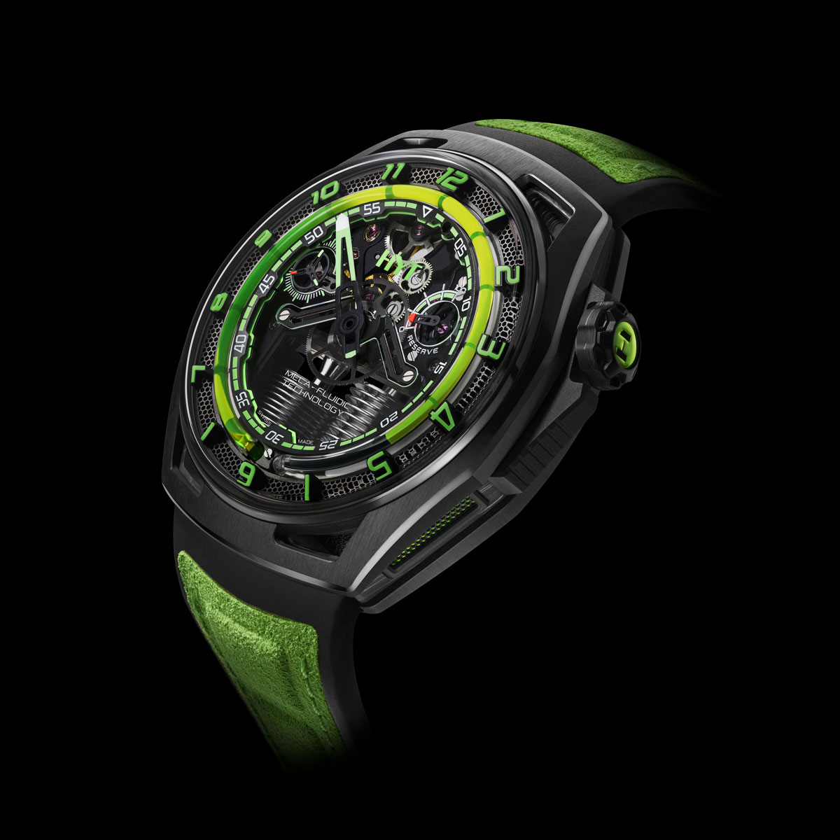 The openwork dial has a domed sapphire crystal allowing the user to see the textured structure with a more refined design. Both the mechanical section on the top and the fluidic section below can be observed thanks to the hollowed-out mainplate covered by a sapphire plate. The lime green luminescent hour indications contrast sharply with the watch’s black theme.