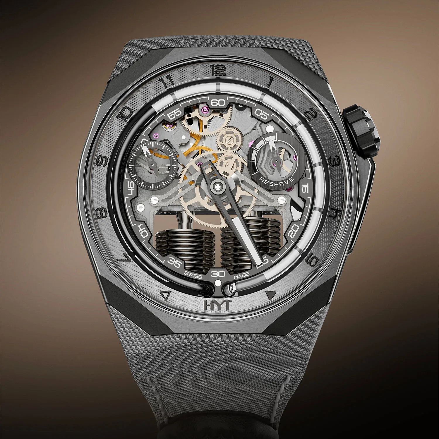 As always with HYT watches, it’s the dial where things get really interesting. The anthracite DLC and rhodium-plated brass provide backdrop to the signature HYT hydromechanics. The dual bellows at 6 o’clock work in tandem to compress and expand, transporting the liquids through the capillaries. The point where the black liquid meets the transparent one, is your current hour. The whole process is reset for another 12 hours cycle when the liquid has reached the end. Arabic numerals on a grey honeycomb chapter ring are quite sporty, while the central minutes hand and power reserve indicator feature black gold with white Super-LumiNova accents.