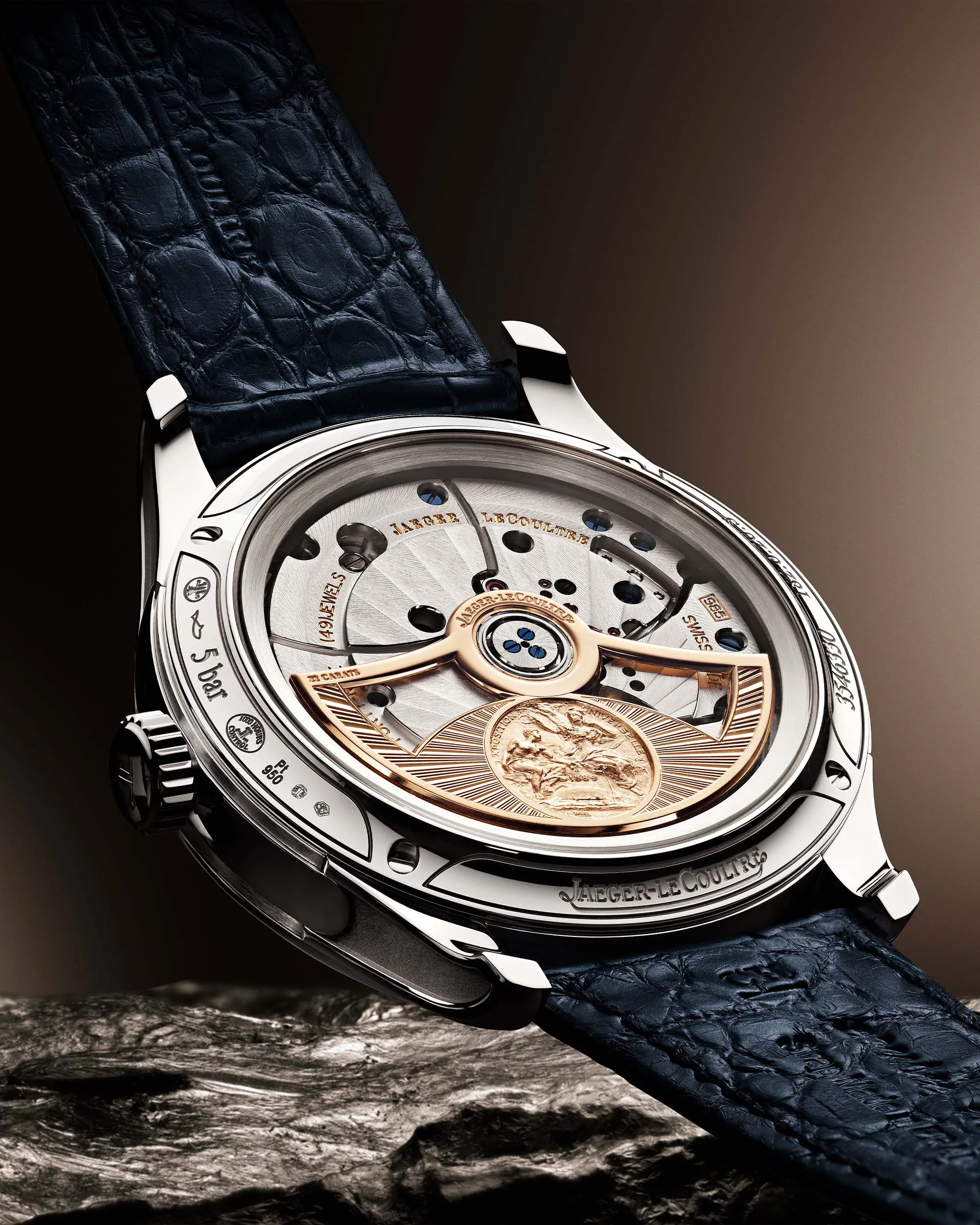 There’s no running seconds hand on these watches as such, that’s because instead we get a good view of the Calibre 985’s tourbillon. The escapement in this watch is quite unique as the balance wheel insider the tourbillon uses a cylinder-shaped hairspring rather than the traditional flat spring. This is a design from centuries ago that’s been brought into the 21st century, Jaeger-LeCoultre says the cylinder hairspring is more accurate than a traditional spring. It is much harder to make, though, but Jaeger-LeCoultre has the knowhow to make its own hairsprings which is a rarity in the watch world. As for the specs, you can expect the calibre 985 to last for about 45 hours, and it has a 4Hz beat rate. The movement is self-winding with a gold rotor embellished with a representation of a medal won by company half-namesake Antoine LeCoultre.