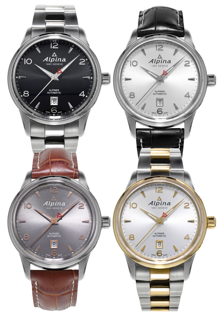The new Alpiner Automatic comes in four variations: including: a black sunray dial with black alligator strap, white sunray dial with a stainless steel and gold PVD coated bracelet, white sunray dial with black alligator strap and one with a grey sunray dial and brown alligator strap.