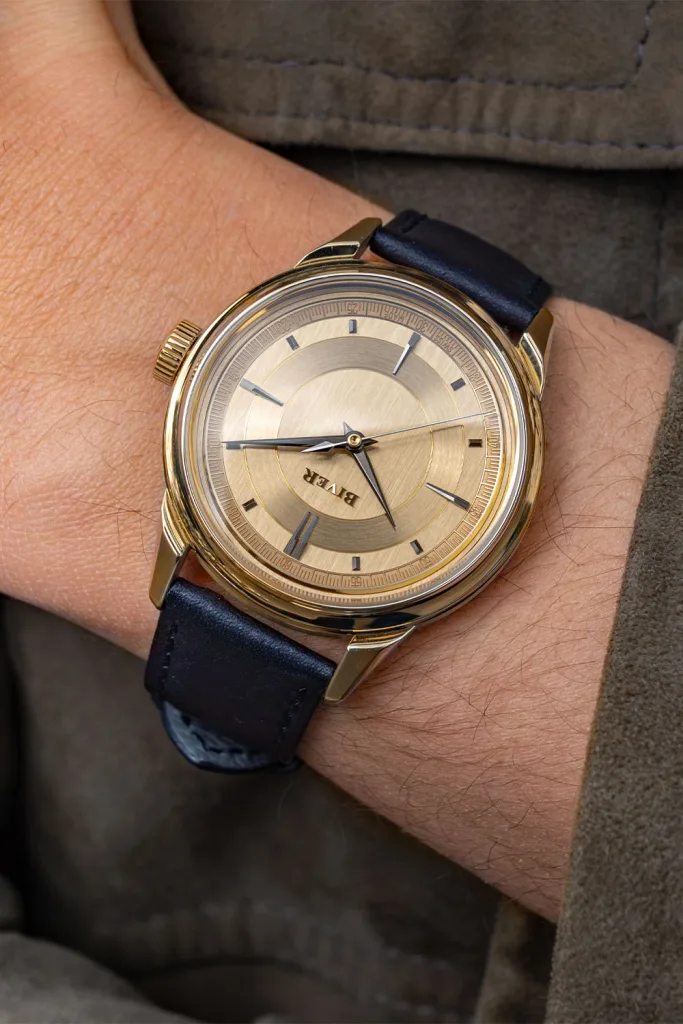 First off, the Yellow Gold. It’s a bit of a throwback, sporting a proper yellow gold dial with a brushed do and some grained bits in the middle. The hands and markers are a darkish grey, offering a sharp visual counterpoint to the gold. It’s strapped on with a black nubuck leather, simple as you like. Asking price is CHF 75,000.