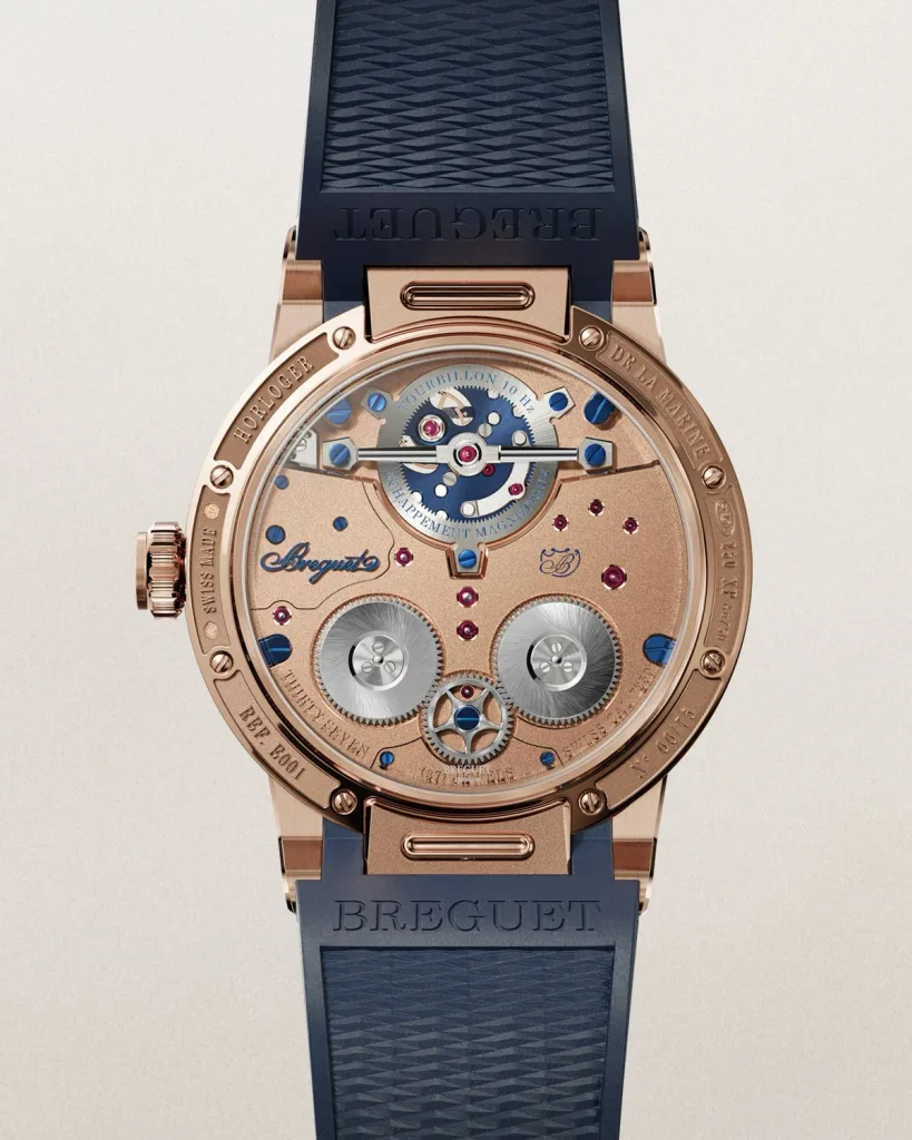 The dial side offers the most impressive view, of course, with the calibre 7250 visible through the openworked dial. The Expérimentale 1’s regulator dial layout should provide easy reading, which is good because Breguet’s lovely but thin blued hands sometimes get a bit lost in the view. The movement is set under a box-type sapphire crystal and within a Marine-style case measuring 43.5mm x 13.3mm with 100m of water resistance. The coin-edging (or fluting, as they would call it) is back and looking thoroughly modern. We had quite a few comments on Breguet’s fluted cases in our last publication, see here. The watch is presented on a blue rubber strap with a pin buckle made from Breguet Gold.