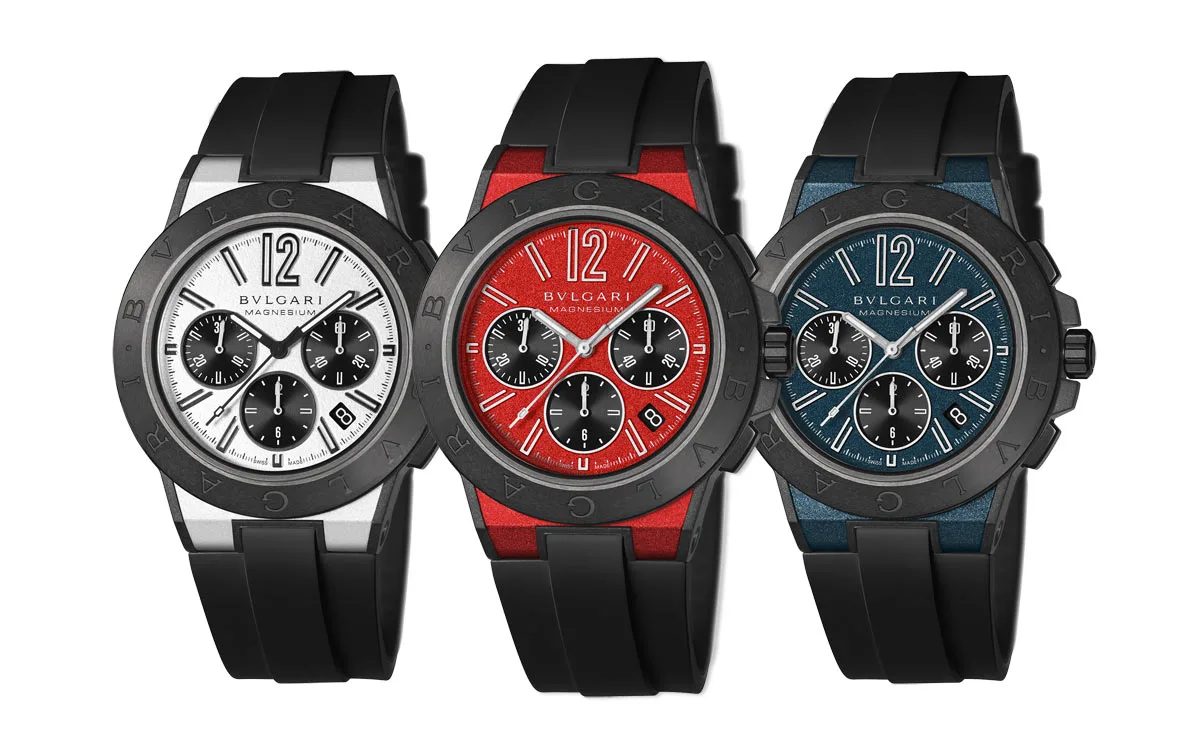 If the Italian classic car speedo style numerals and the tuning fork shaped indexes in-between tempt you, the 100m water resistant Bulgari Diagono Chronograph Magnesium will cost $4950.