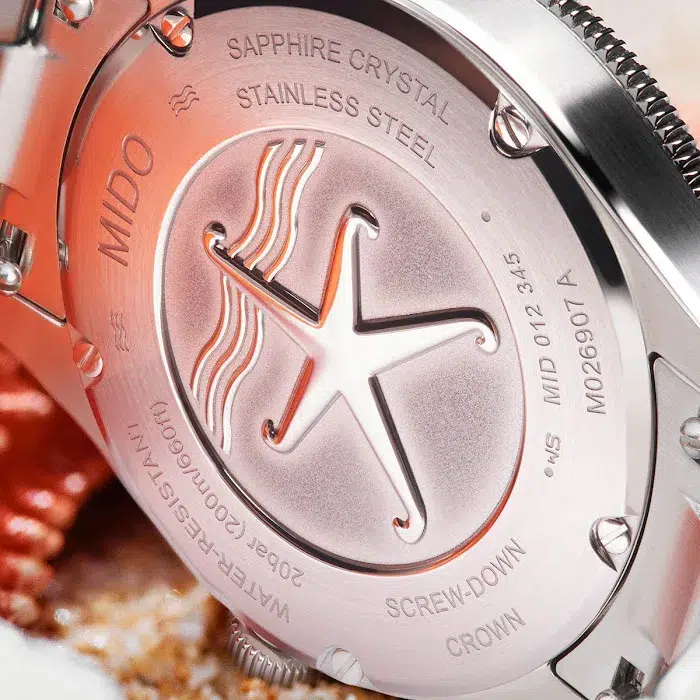 Inside all of these models is the self-winding calibre 72, which started out life as the ETA calibre A31.111 which, according to my source on these matters, can be traced back to the ETA 2892-A2 that’s also used by Sinn, Bell & Ross, TAG Heuer and many more. In the Mido, the calibre 72 has a 72-hour power reserve and a 3.5Hz beat rate and is obscured behind a closed caseback featuring their iconic starfish emblem.