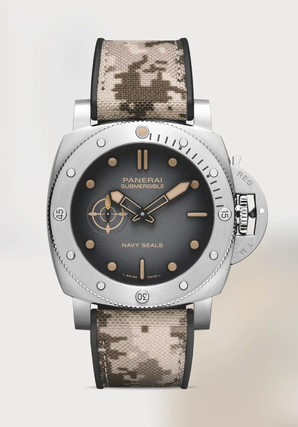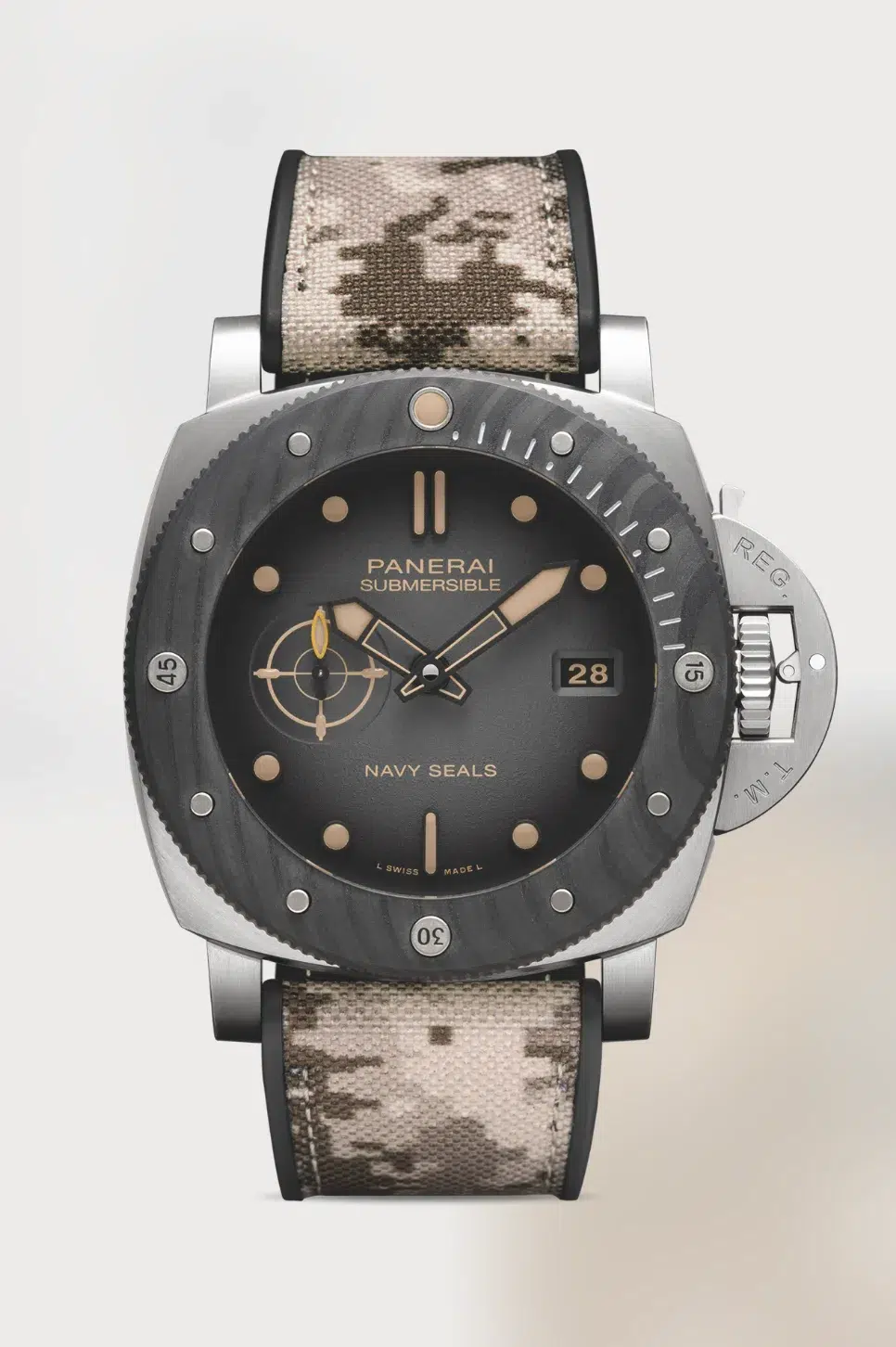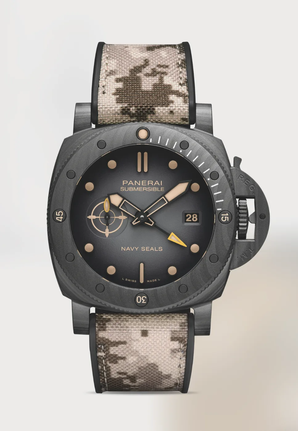 The new collection from Panerai is broken into four models which all appear to be broadly the same. For example, all the watches have a similar dial, which fades from black to grey the further you get to the centre, and they also all have a rubber/fabric strap with a “digital camouflage” pattern, which looks interesting. They all have a special engraved caseback with the Navy SEALs insignia, which is cool. Also, all of these are boutique-exclusive models, so you won’t find them in any old Panerai dealer, only the branded boutiques.