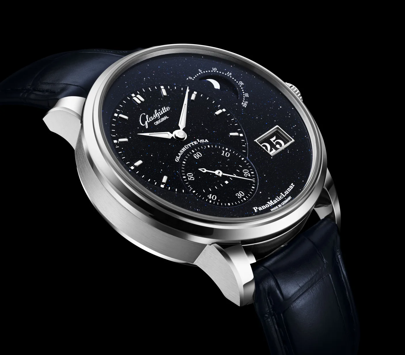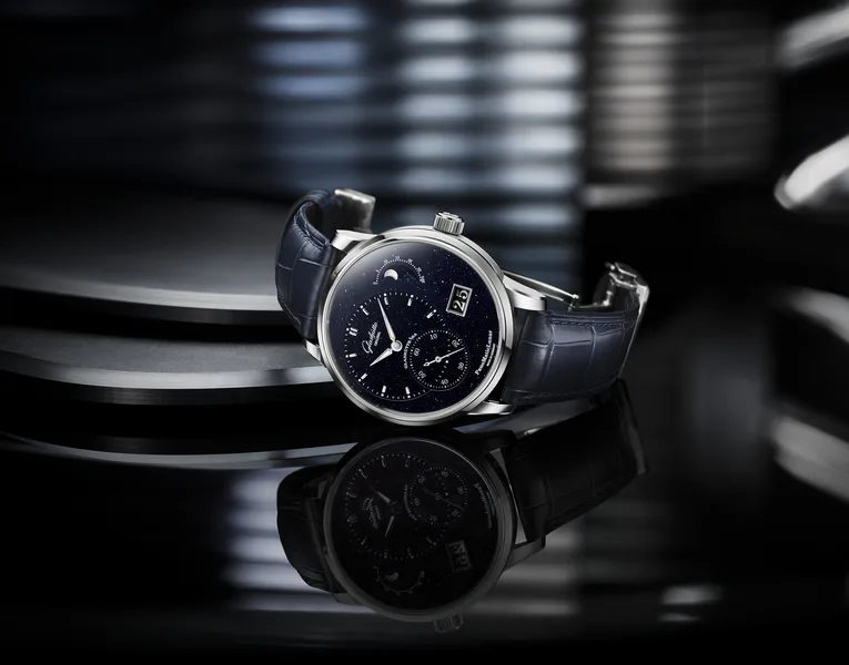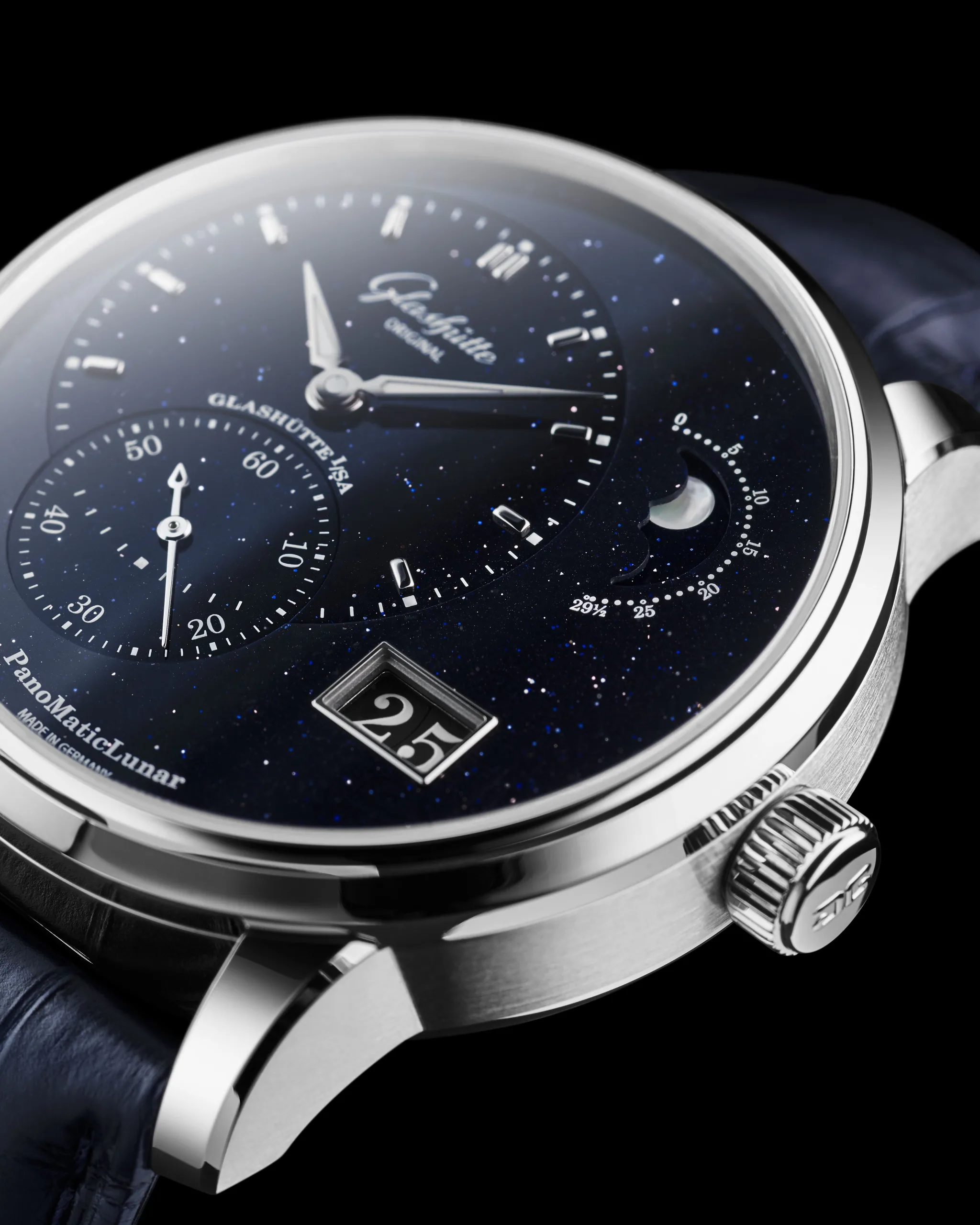 To mark the occasion, Glashütte Original’s watchmakers looked to the skies and were inspired by what they saw. This new limited edition of the PanoMaticLunar features a dial made from aventurine glass, also known as goldstone, which is a first for any Glashütte Original watch. Supposedly invented by accident by Venetian artisans on the island of Murano in the 17th century, but with some artefacts known to have existed since the 12th century (see the bibliography of that link), aventurine glass is renowned for its glittering appearance. It’s easy to see why Glashütte Original, having been inspired by the stars, chose this material for their dial. The little reflective flecks in the dark blue backdrop shine and give a special frame to the moonphase complication this watch features.