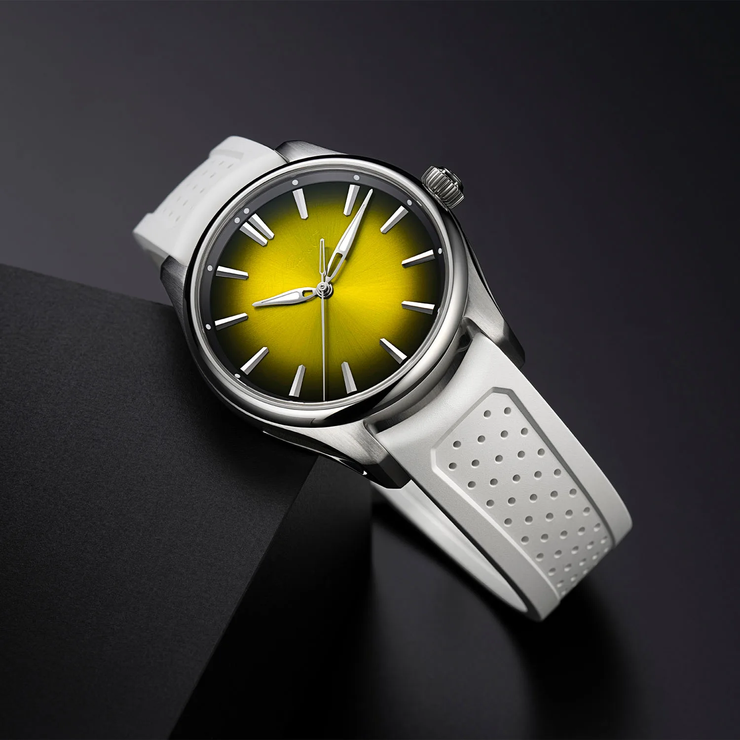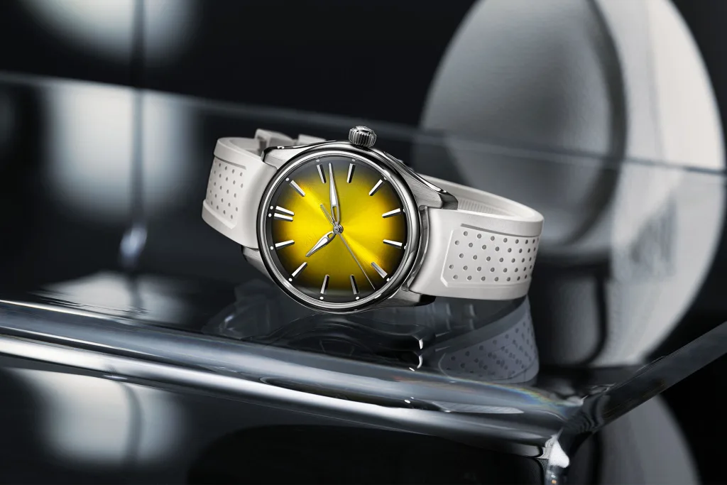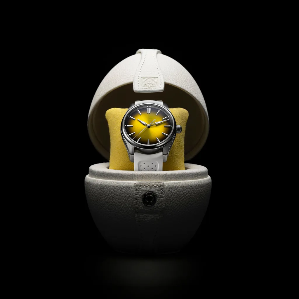 At first glance, the yellow fumé dial is all sunshine and good mood, but zoom in and you’ve got that trademark Moser gradient that shifts from bright egg-yolk yellow at the center to a darker tone at the edges. It’s vibrant, punchy and just a little cheeky.