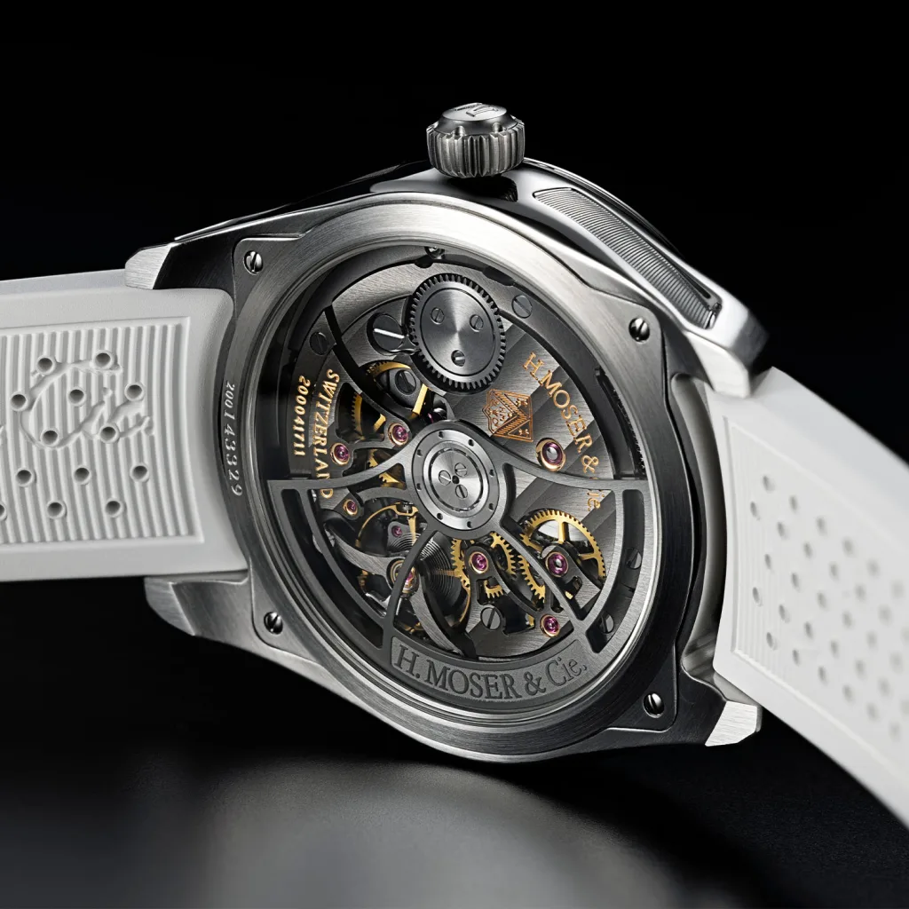 Flip the watch over and you’re greeted by the HMC 201 movement; a slightly upgraded version of the HMC 200. You’re looking at 72 hours of power reserve, Straumann hairspring, and all the striping and skeletonization that make Moser’s calibers so photogenic through that sapphire caseback.