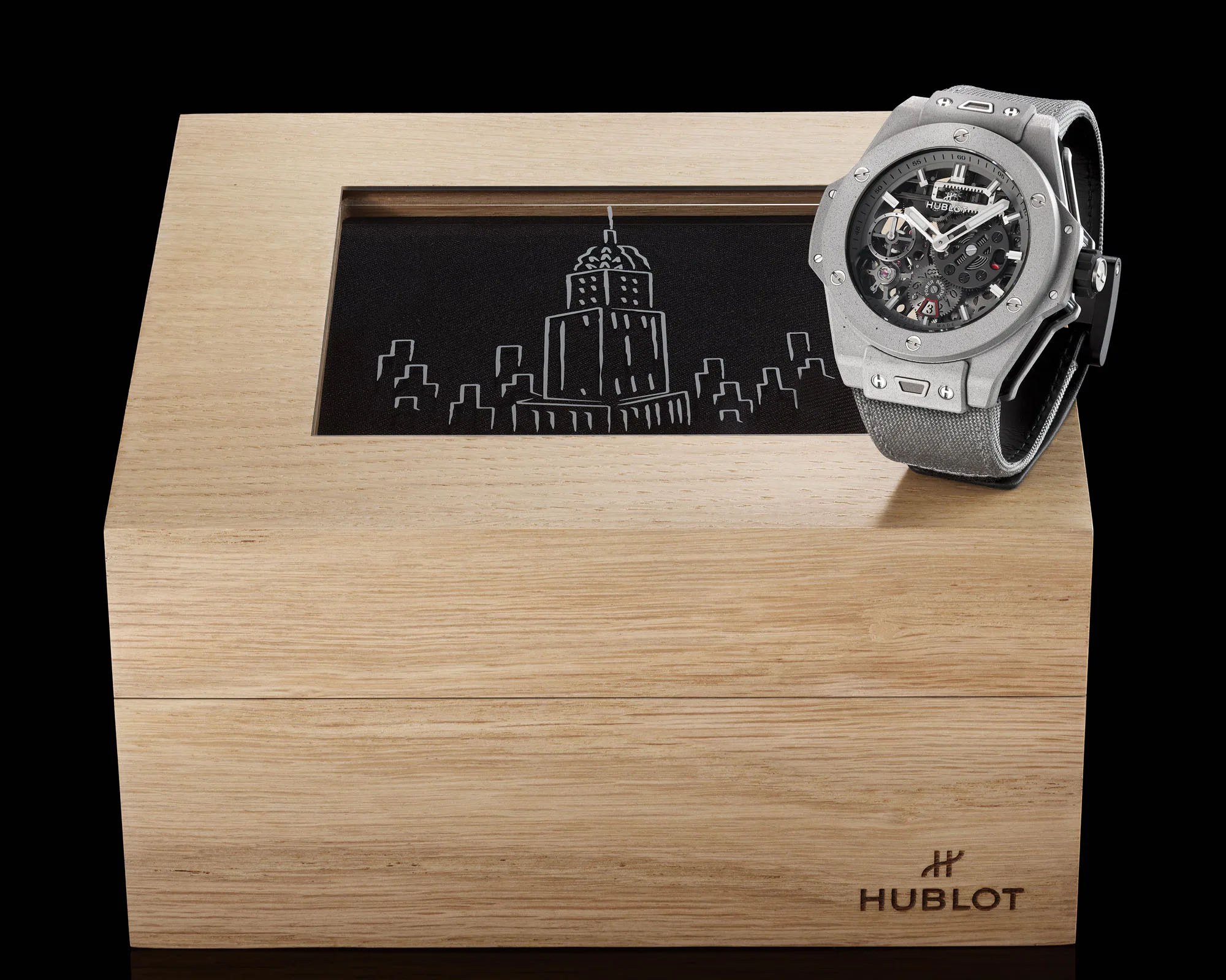 The Concrete Jungle is sold with two straps, a grey fabric one with velcro closure for the utilitarian inclined, and a black rubber option for the rain slick city dweller. Both latch onto a black titanium and ceramic folding clasp. Priced at $34,100, it’s nestled just beneath Hublot’s gold-cased offerings. Availability is limited to the United States.